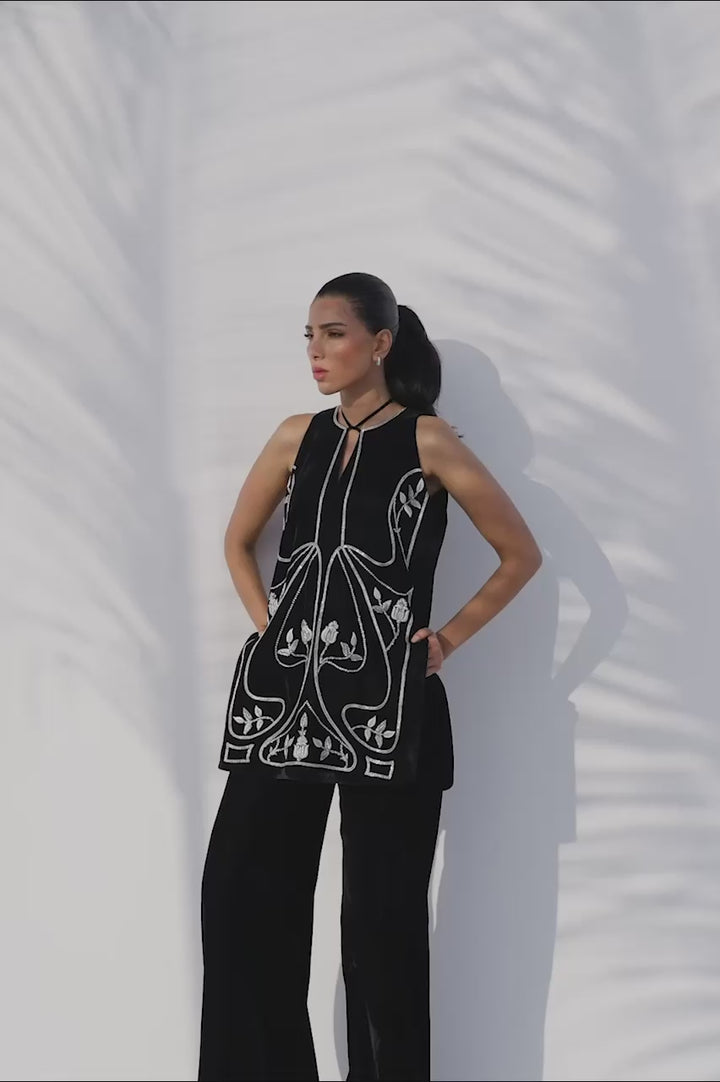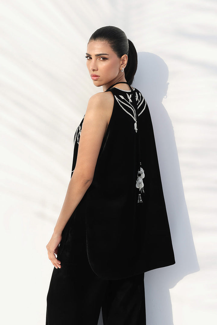 This ebony velvet creation radiates quiet luxury, featuring intricate nature-inspired zardoze embroidery that exudes an ethereal charm. The softly tied neckline lends a touch of refinement, gracefully framing the face as the fabric drapes with liquid fluidity. Paired with tailored trousers, this ensemble is a seamless fusion of timeless artistry and modern elegance.