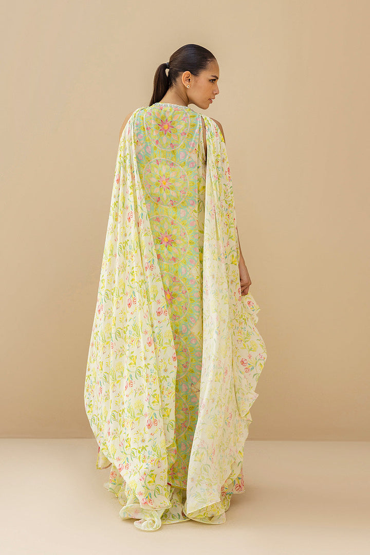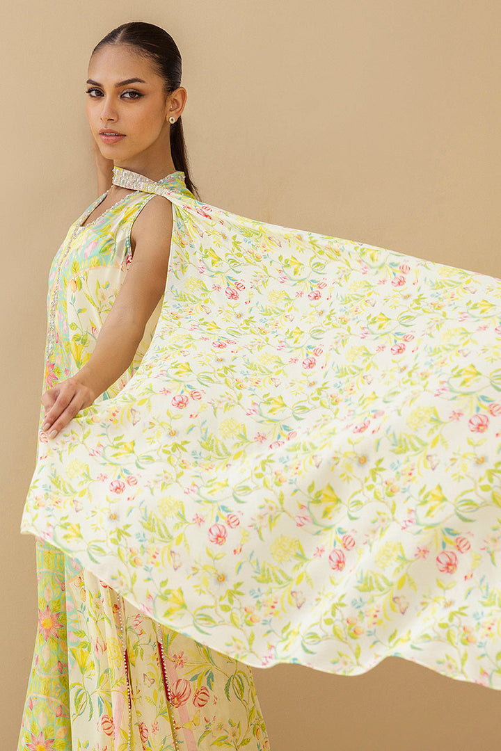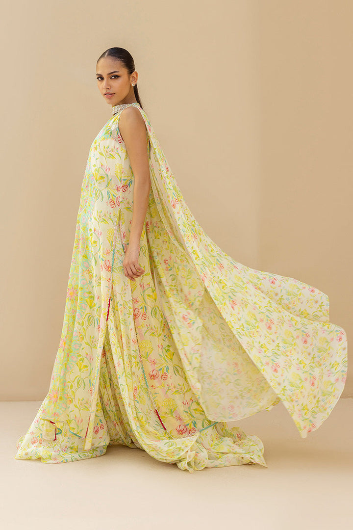 Bathed in luminous citrus tones, this sleeveless georgette shirt flows with painterly florals arranged in symmetry. The neckline glimmers with zardoze and pearl embroidery, lending iridescence to its fluid form. Paired with flared pants in matching georgette and a billowing chocker dupatta in the same botanical print, the look is romantic, and endlessly modern.