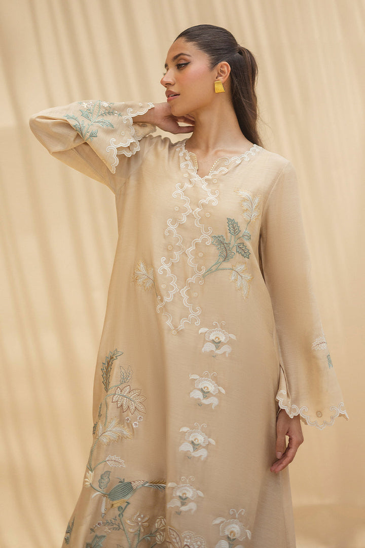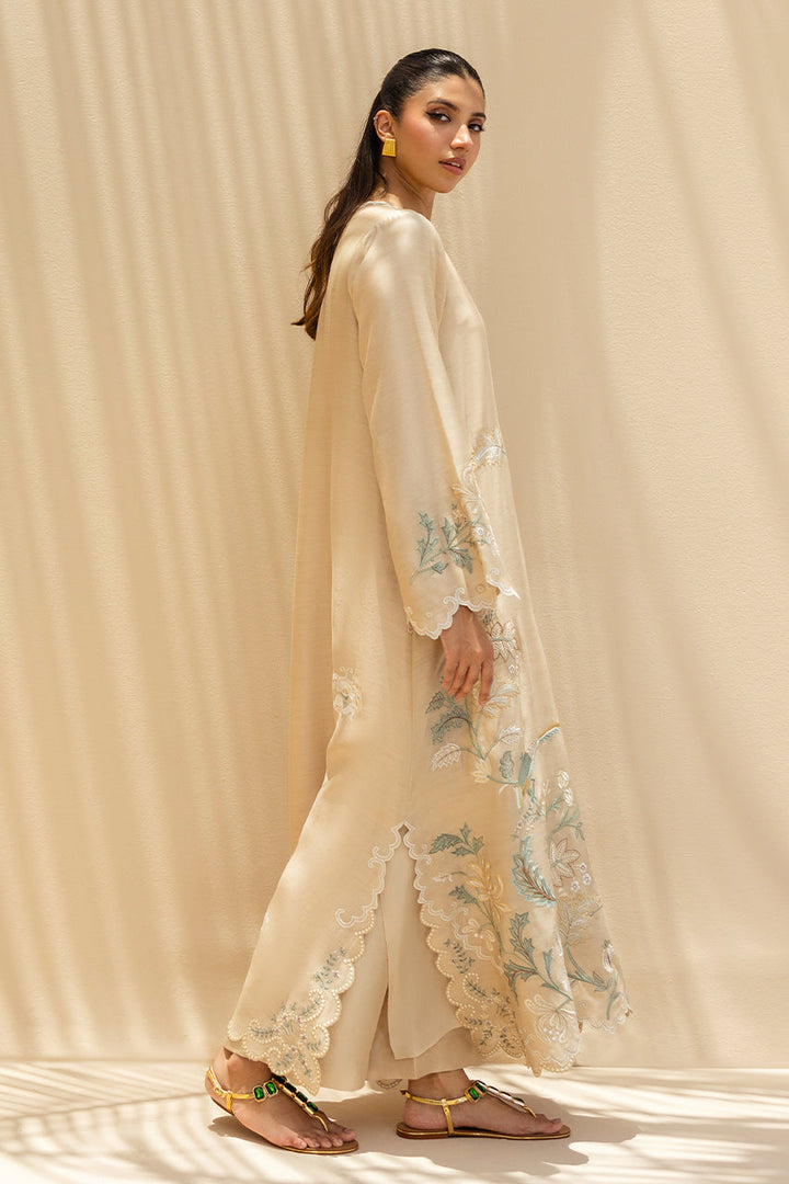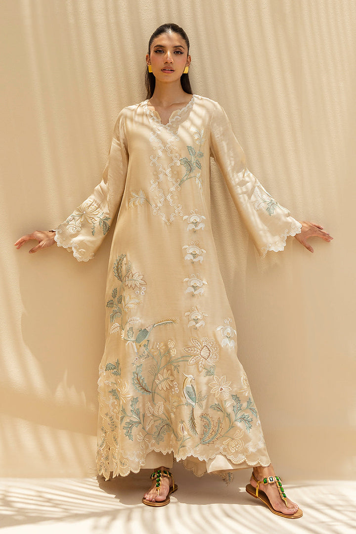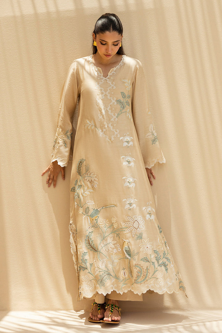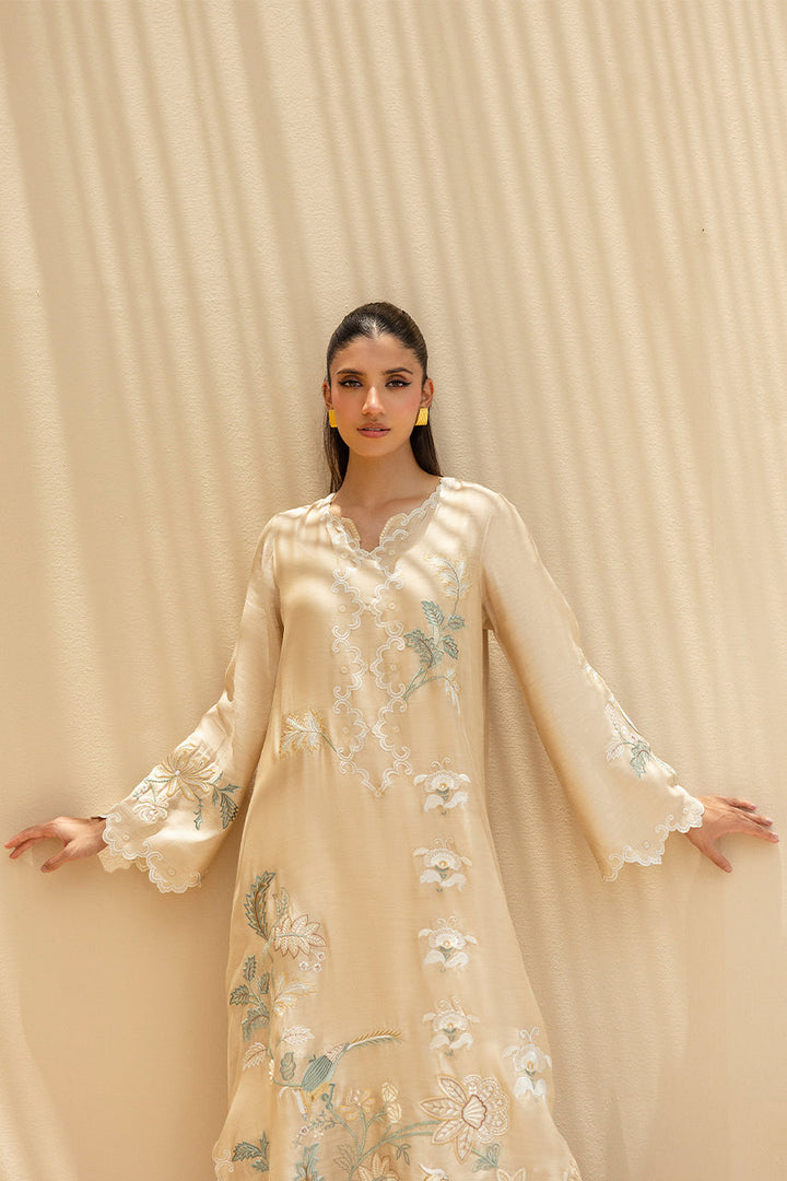 Ethereal and weightless, this relaxed kaftan in khaddi silk is adorned with intricate botanical embroidery in muted celestial tones and soft ivory. Scalloped hems, fluid sleeves and artisanal detailing lend it a poetic grace. The look is completed with matching pure rawsilk culottes.