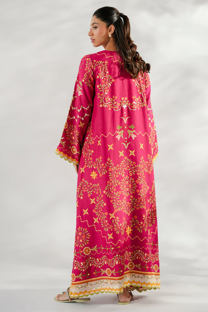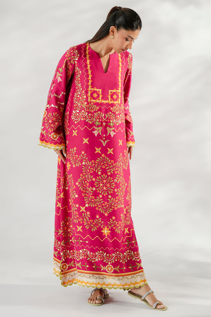 A fluid kaftan crafted from khaddi silk, awash in a ruby red printed canvas, falls languidly. The hemline and sleeves are edged with delicate scallop accents in muted lime hue, lending an unexpected freshness and anchoring the piece with artisanal depth. Embroidered gota details elevate the marigold, sage, and soft tangerine toned print meandering across the expanse.