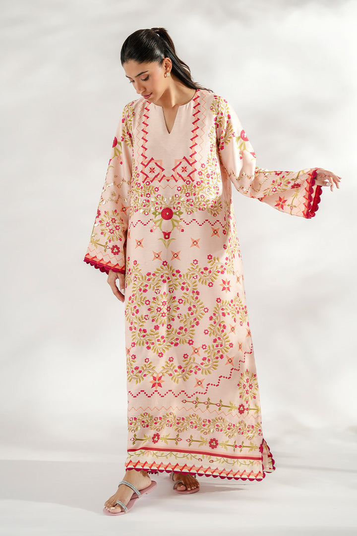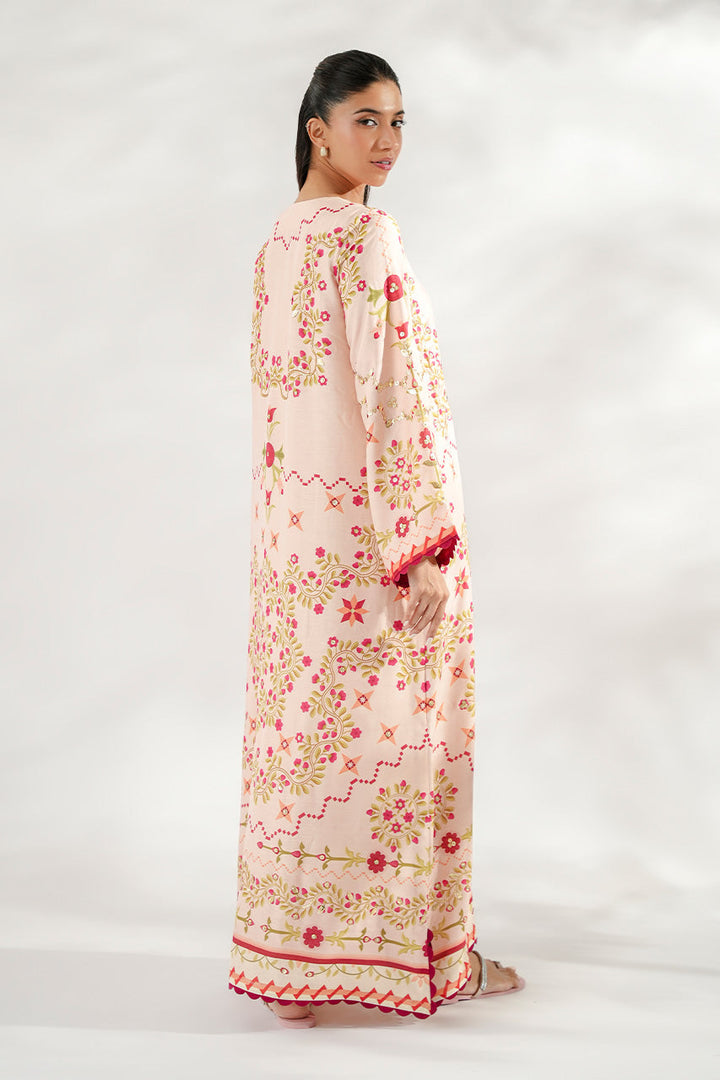 A fluid kaftan crafted from khaddi silk, awash in a blush quartz printed canvas, falls languidly. The hemline and sleeves are edged with delicate scallop accents in muted lime hue, lending an unexpected freshness and anchoring the piece with artisanal depth. Embroidered gota details elevate the hot pink, muted olive, and soft coral toned print meandering across the expanse.