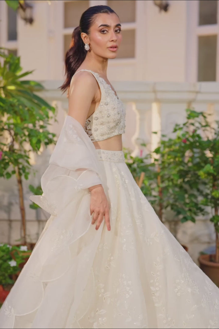 An ethereal lehnga set in moonlit ivory organza, delicately hand embroidered with tonal florals and sequins. The cropped choli, cut in a sleeveless V-neck silhouette, is adorned with resham and beadwork in intricate detail. Paired with a voluminous organza lehnga layered in sheer panels and embroidered with floral eyelet motifs, its ruffled hemline adds graceful depth. A diaphanous dupatta, softened with embroidered florals and scalloped edges, completes the ensemble with poetic finesse.