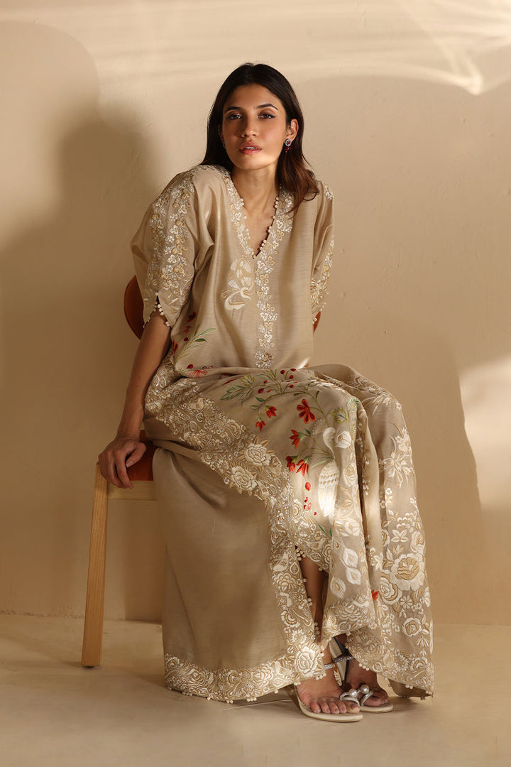 A luminous sand hued slender kaftan is embroidered with delicate ivory florals and vibrant scarlet blooms, evoking painterly elegance. Intricate resham work cascades into a breathtaking menagerie of avian and botanical motifs, with a statement peacock embellished along the side slits. Fabric manipulation elevates the V-shaped neckline and sleeves, which feature slits adorned with tonal floral embroidery that climbs toward the shoulders, imitating thriving vines.