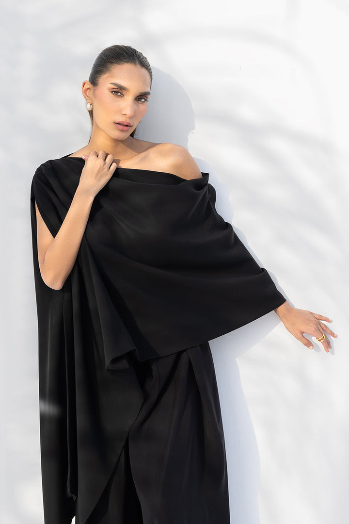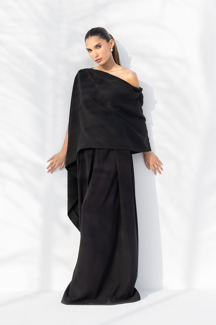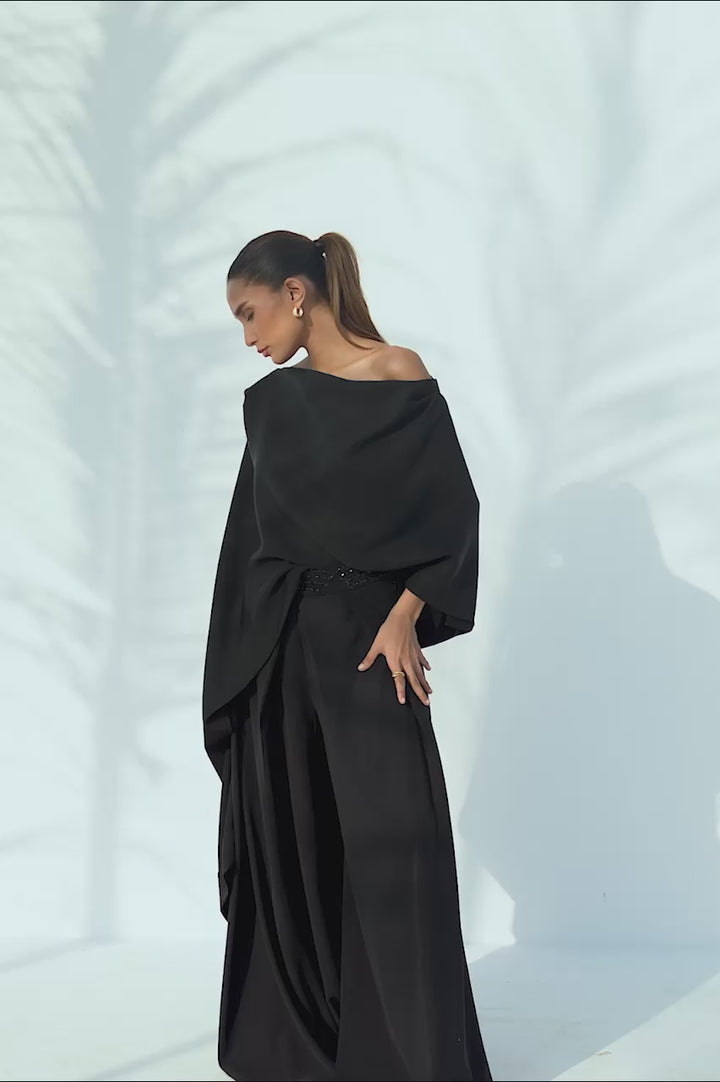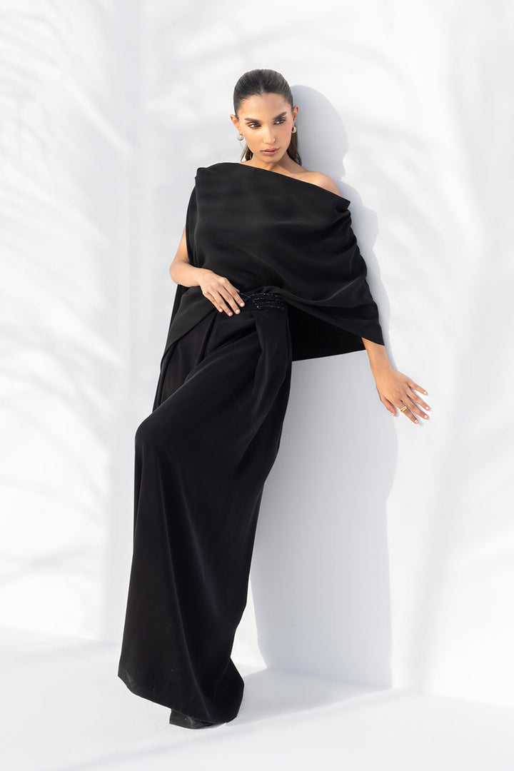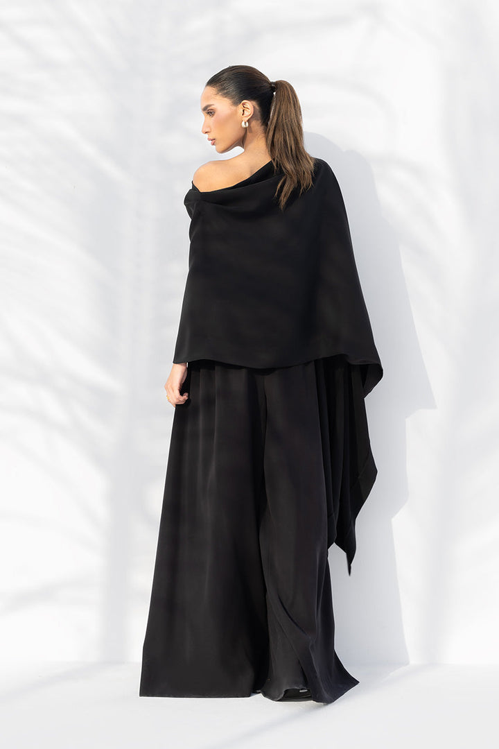 This sophisticated ebony toned ensemble is crafted from Italian crepe, giving it a fluid movement. Featuring a draped, off shoulder poncho top paired with dramatic wide leg palazzos, the look is entirely minimalist, defined by the generous volume and the fabric's luxurious drape.