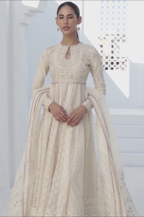 This kalidar peshwas in a beautiful ivory hue, cut from pure khaddi corduroy, is adorned with gota details enhanced with intricate embroidery and screen print inspired by subcontinental heritage. The look is paired with matching khaddi silk chooridar. The embroidered organza dupatta completes the look.