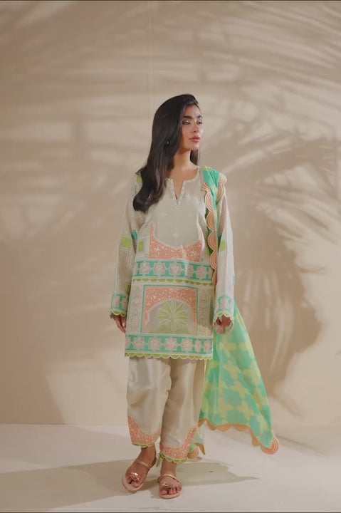 A soft ivory khaddi corduroy canvas comes to life with geometric and botanical appliqué embroidery in citrus, pistachio, and glazed turquoise tones. The embroidered shirt features a split neckline with scalloped sleeves and hem, evoking a sense of summer nostalgia. It is paired with a cotton net dupatta printed with lime and turquoise geometric motifs and finished with an embroidered border, along with a pure rawsilk shalwar detailed with an embellished hem.