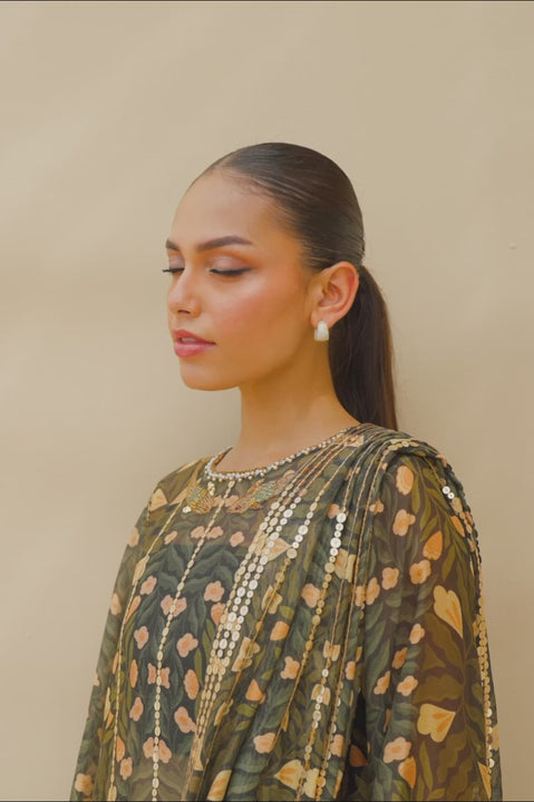 Exuding glamour, this floor-length shirt is crafted from rich, deep olive green and ebony-hued cotton net. The sheer fabric is overlaid with an olive and butter yellow leaf print, elevated by stripes of shimmering gold sequins. The silhouette features masterful draping, paired with a matching pre-draped cotton net dupatta embellished with gold sequins. Defined by its dynamic print and glittering sequin details, the look is completed with a matching pure rawsilk tube top and printed khaddi silk culottes with sequin-accented hems.
