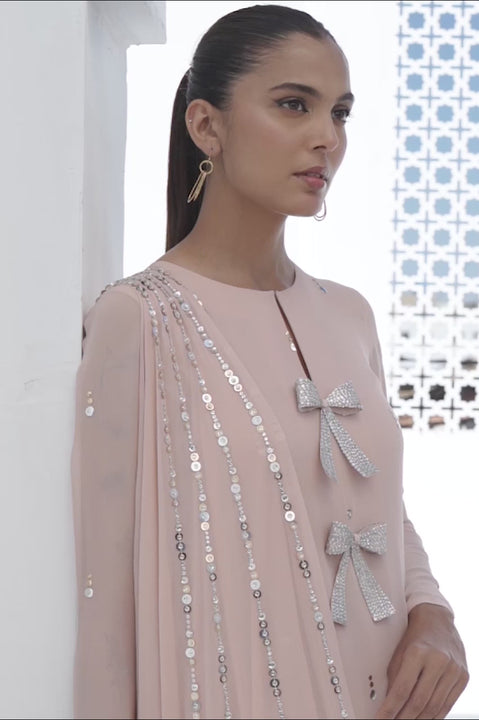Exude charm in this rose pink colored georgette draped shirt with minimalistic kamadani work. The bejewelled silver bow detailings add to the charm. The look is completed with matching rawsilk trousers.