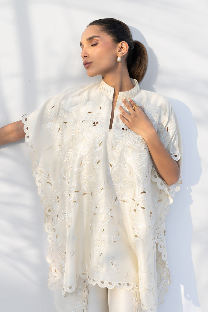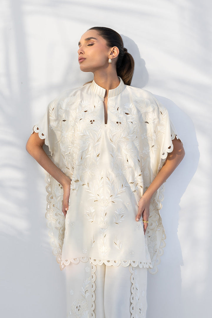 This ivory-hued pure Raw Silk outfit makes a statement with a textural, cutwork design. A box cut shirt with a mandarin collar, adorned with intricate, oversized floral cutwork embroidery and a scalloped hem. The top is paired with flared overlap pants that continue the same detailed floral cutwork, featuring a scalloped border. The look is entirely defined by the striking three-dimensional texture created through resham and appliqué craftsmanship.