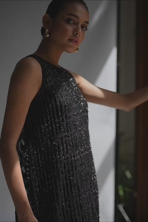 Black net is beaded in thin geometric lines, with constrasting large-scale beaded geometrics on the back on this long silhouette. The sparkle adds edginess to the piece as it follows through to beaded flowers on rawsilk bootlegged trousers. Perfect for a formal event or evening soiree, this ensemble is a wardrobe must have.