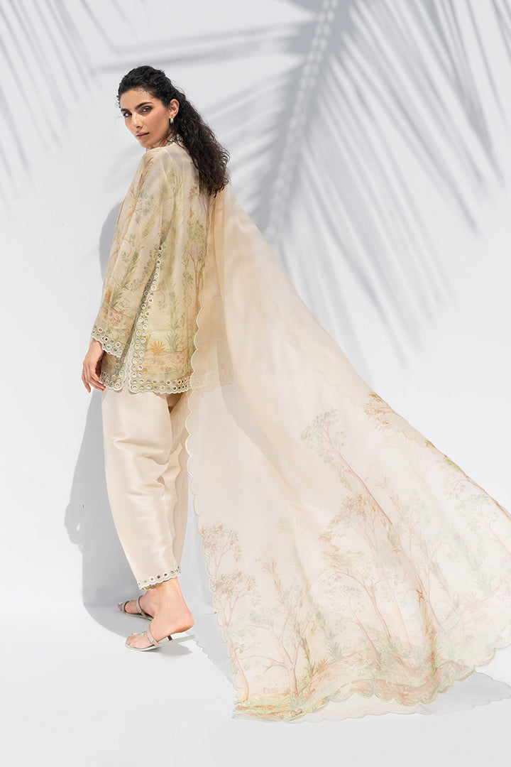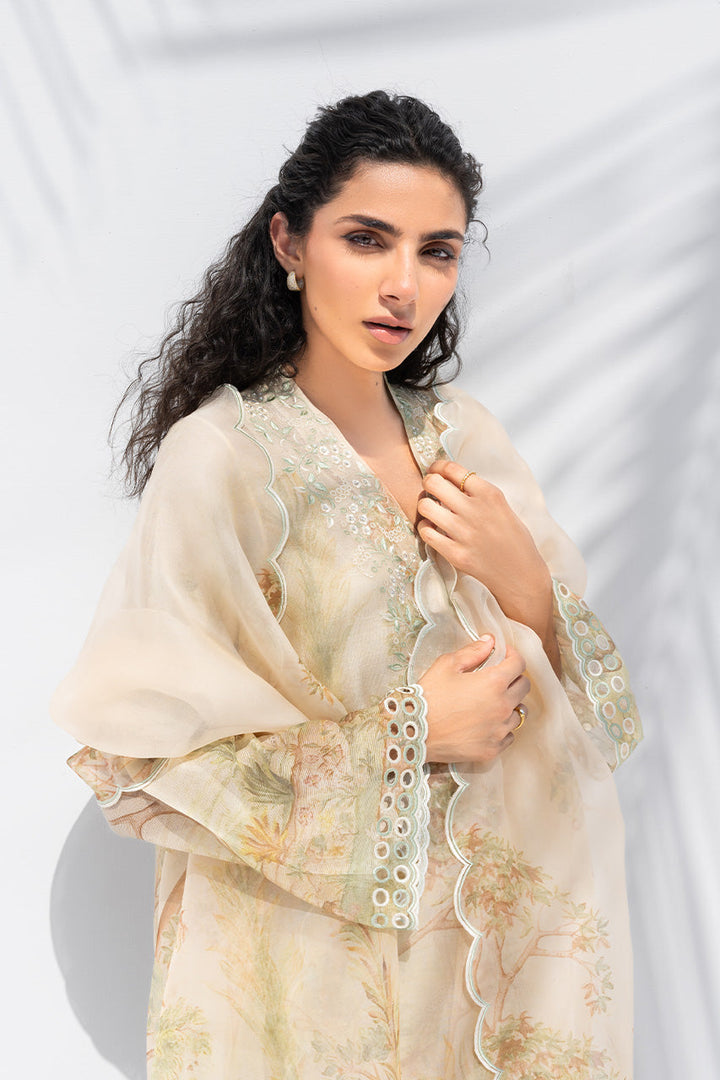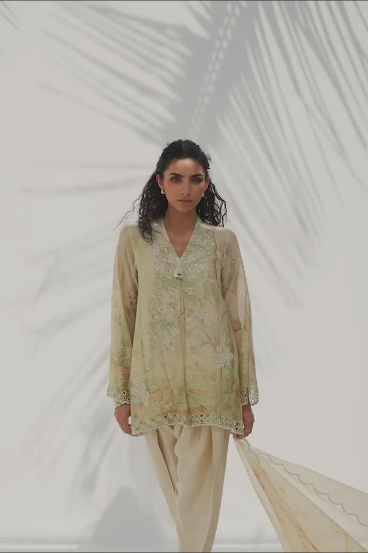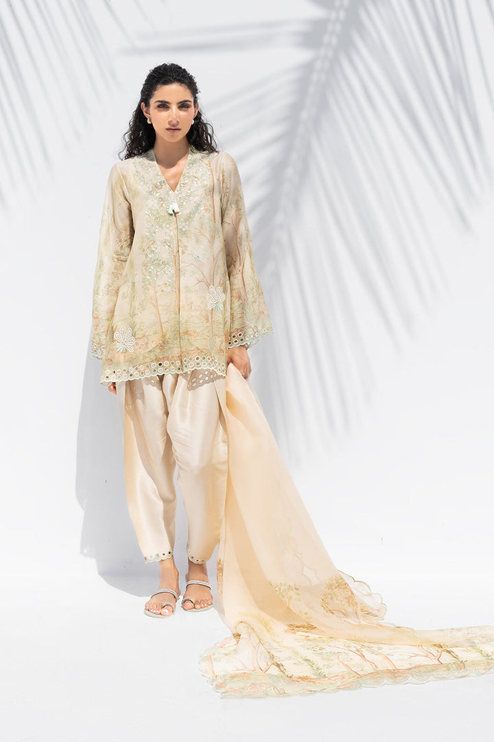 Soft and ethereal, this pale blush ensemble captures the essence of understated femininity. The relaxed top, crafted from cotton net, is adorned with a painterly botanical print and intricate tonal embroidery in delicate floral motifs, with eyelet detailing along the hemline and sleeves. It is paired with matching pure Raw Silk shalwar, creating a harmonious interplay of texture and light. A sheer organza dupatta, framed with wide floral appliqué and finely embroidered borders, cascades gracefully to the floor, completing the look with serene elegance.