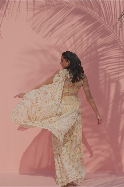 This fluid ensemble is rendered in soft cream, brought to life with delicate botanical prints in warm ochre tones. The organza peplum silhouette is paired with a georgette pre draped dupatta finished with scalloped edges, adding movement and dimension to the bodice. Flowing khaddi silk dhaka pajama mirror the print, lending continuity and ease. Light, romantic, and effortless, the ensemble makes a soft, elegant statement.