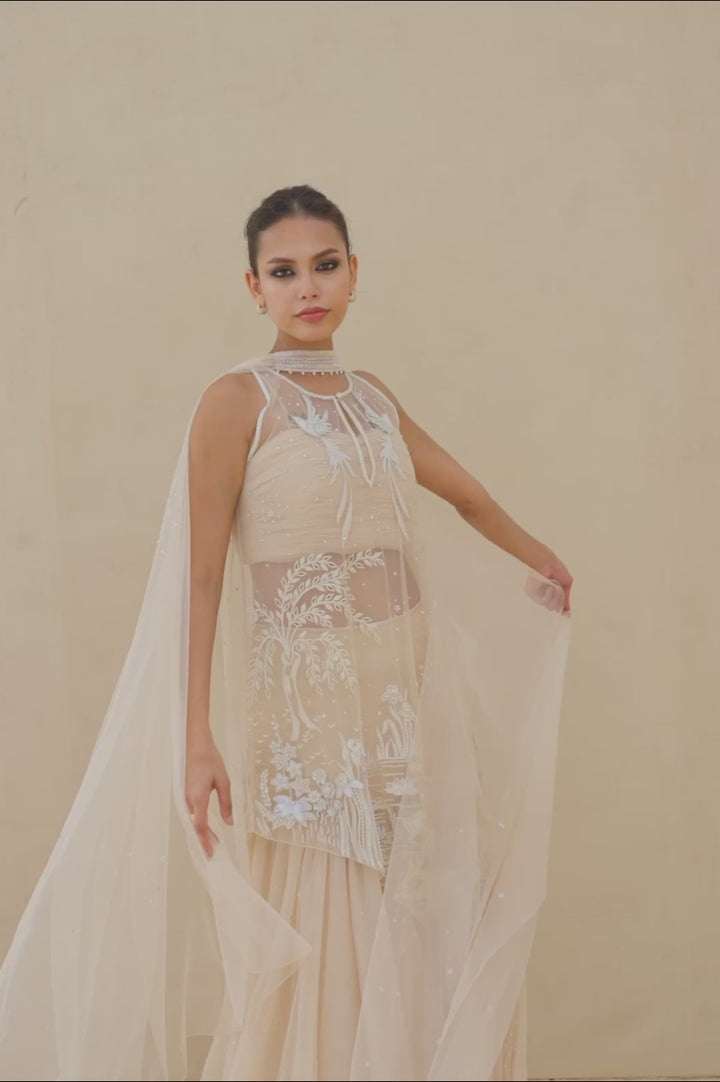 A vision in soft peach tulle, this ensemble unfolds in fluid layers of drapery. The asymmetrical shirt, sheer and delicately structured, is embroidered with ivory threads, beads, and sequins that trace blooming florals across its surface, finished with eyelet accents. A refined neckline with subtle linear embellishments adds depth and dimension. Flowing into a voluminous tulle skirt, dusted with faint shimmer and resham florals, the silhouette carries a dreamlike lightness. A matching tulle choker dupatta with beaded borders and a ruched tulle bandeau completes the look with quiet grandeur.