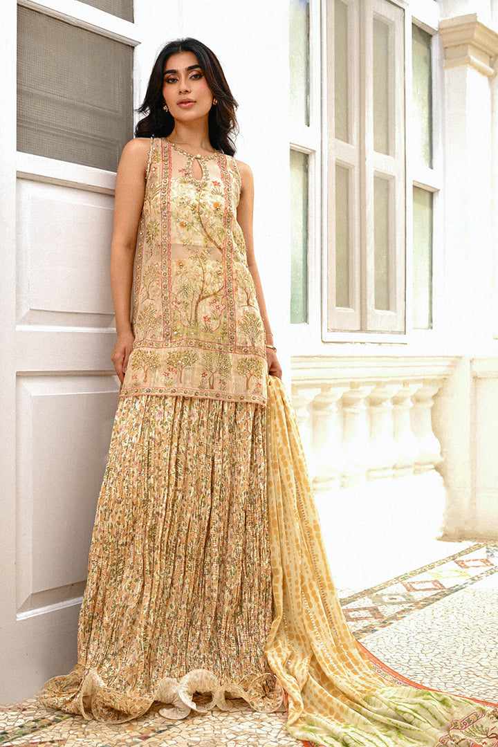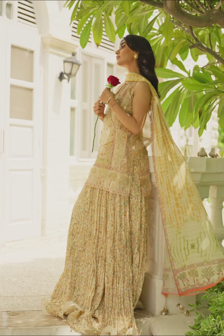 In muted beige and earthy tones, this sleeveless kurta is crafted from sheer organza, delicately printed with florals and embellished with gold sequins, pearls, and fine threadwork. A keyhole neckline lends a subtle contemporary edge, while borders traced with intricate zardoze detailing frame the silhouette. It is paired with a voluminous crushed lehenga in printed khaddi silk and a matching tube top. A diaphanous georgette dupatta, patterned with delicate motifs and finished with embroidered edges, completes the look with refined charm.