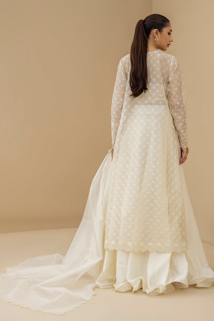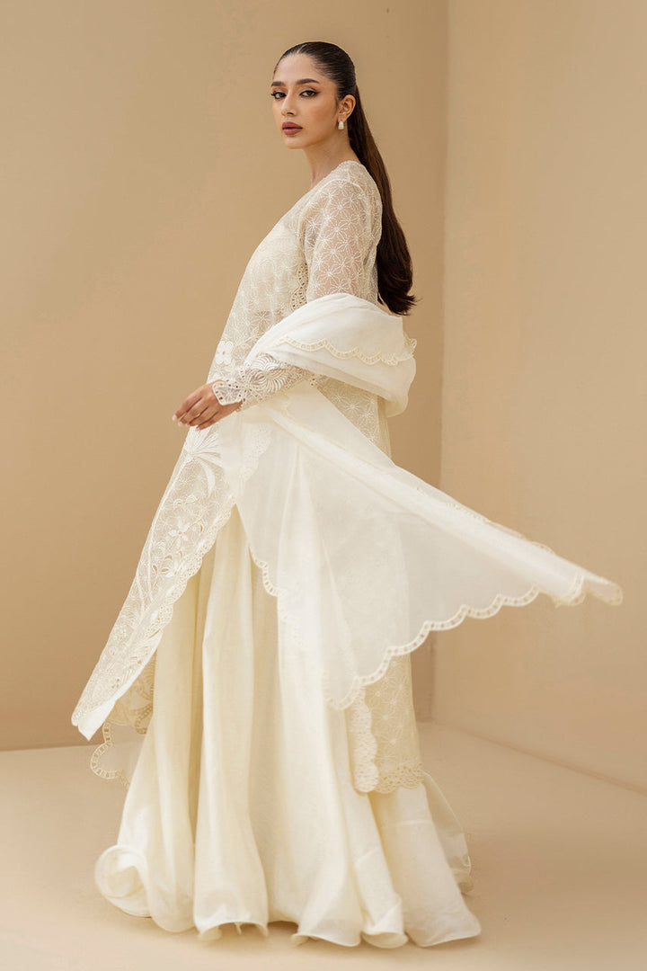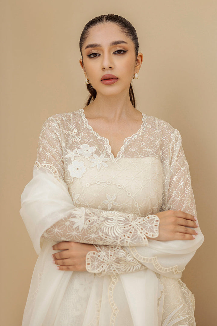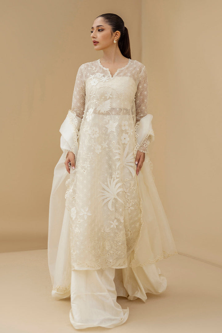 An ode to ivory serenity, this ensemble unfolds in sheer organza embroidered with tonal florals, lattice vines and delicate appliqué and eyelet details, shimmering softly with sequins. The long fluid shirt features a scalloped neckline and diaphanous sleeves. It is paired with voluminous khaddi silk dhaka pajama and completed with a matching organza dupatta edged in scalloped eyelet embroidery, capturing the essence of timeless elegance.