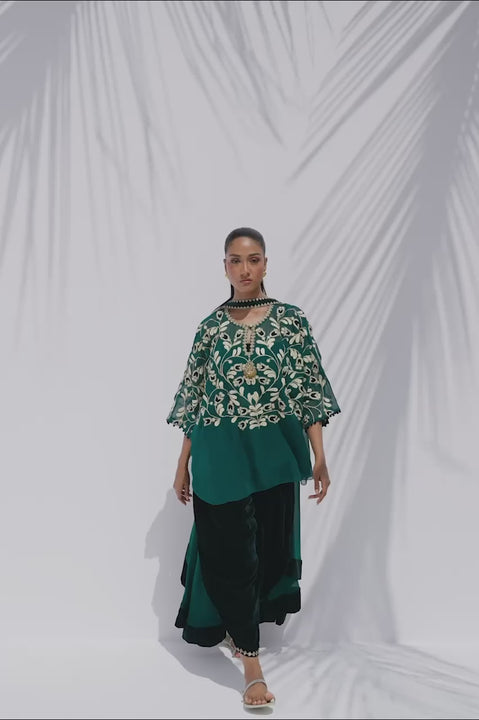 A deep emerald hue defines this effortlessly regal ensemble. The boxy georgette kurta is adorned with ivory dori embroidery and velvet appliqué that bloom across the bodice and sleeves, finished with delicate 3D trims. Paired with a matching velvet tube top and plush velvet shalwar, the draped silhouette evokes quiet splendor. A minimalist pre draped georgette dupatta completes the look with fluid grace.