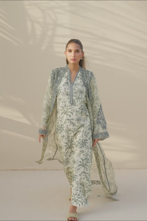 An ethereal ensemble in soft celadon and ivory tones, this look features a delicately printed column dress adorned with avian print and aari embroidered vines on the neckline. The pure rawsilk dress is layered with a sheer, printed organza jacket intricately worked with aari, lending the ensemble a regal feel.