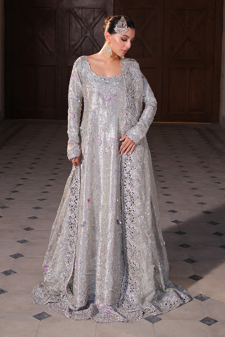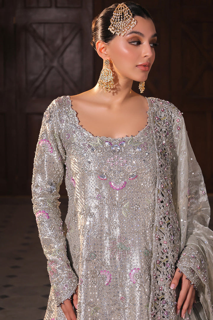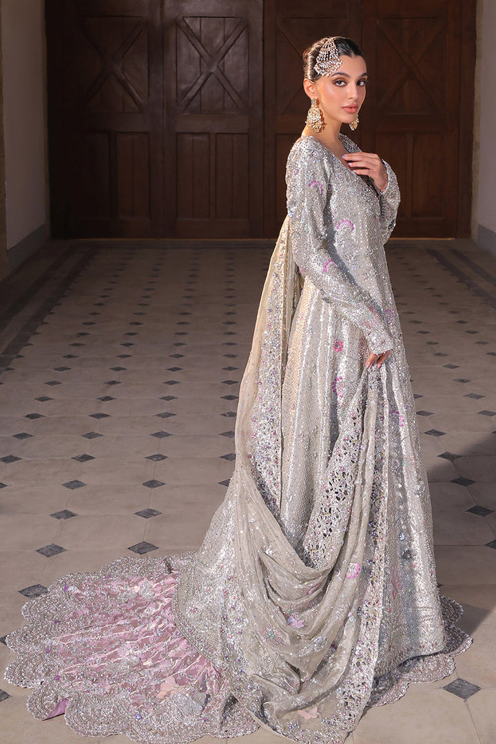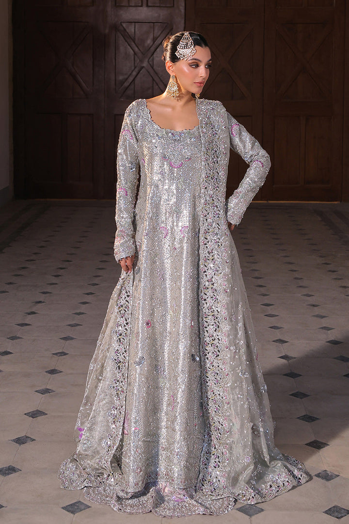 A platinum bridal peshwas shimmers under a cascade of intricate zardoze embellishments,...