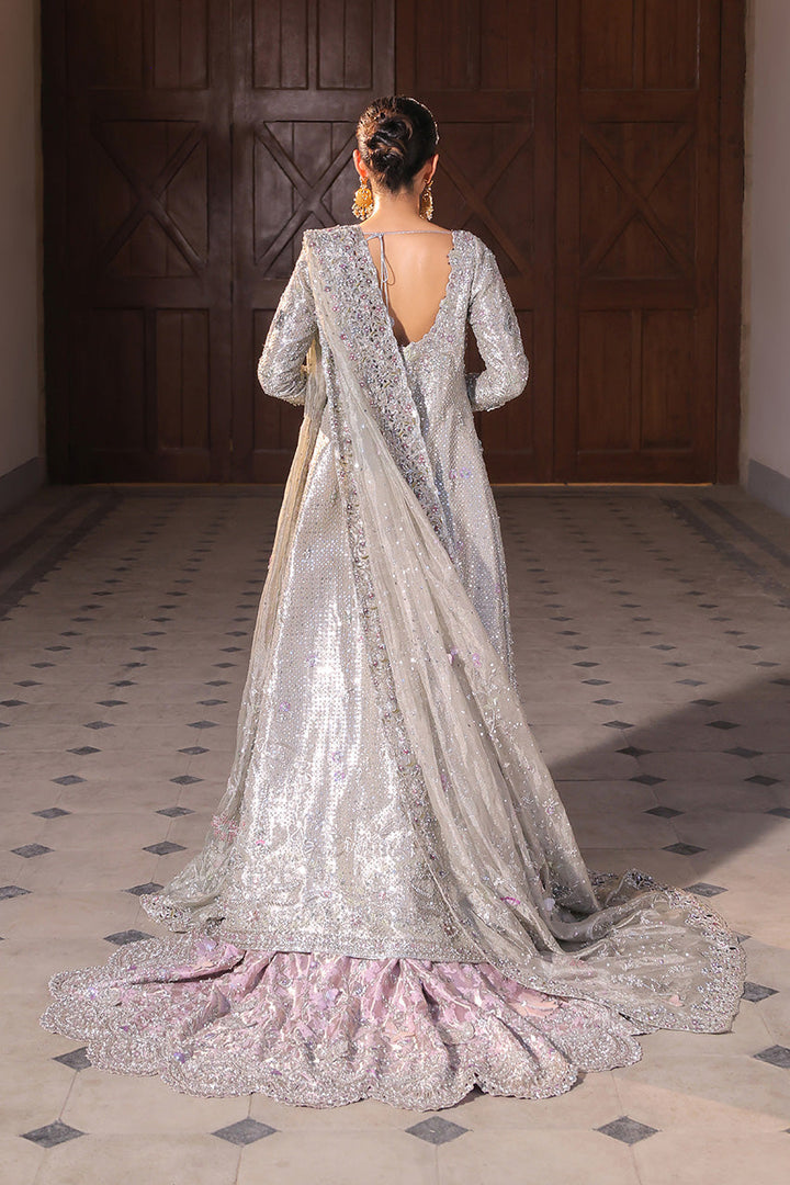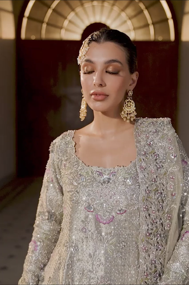 Delivery 4-6 MonthsA platinum bridal peshwas shimmers under a cascade of intricate zardoze embellishments, its surface alive with hand embroidered sequins, cutdana, and pearls. Soft blush and lilac resham florals intertwine with exquisitely rendered peacocks, each detail crafted with stunning precision. The peshwas flows into sweeping panels, creating a statuesque silhouette framed by a scalloped round neckline. Paired with a fully embroidered sheer tissue dupatta, edged in fine cutwork and scattered with tonal blooms, and a matching brocade lehnga with tonal embroidery and a scalloped hem, this is a vision for the bride who dreams of whimsical romance.