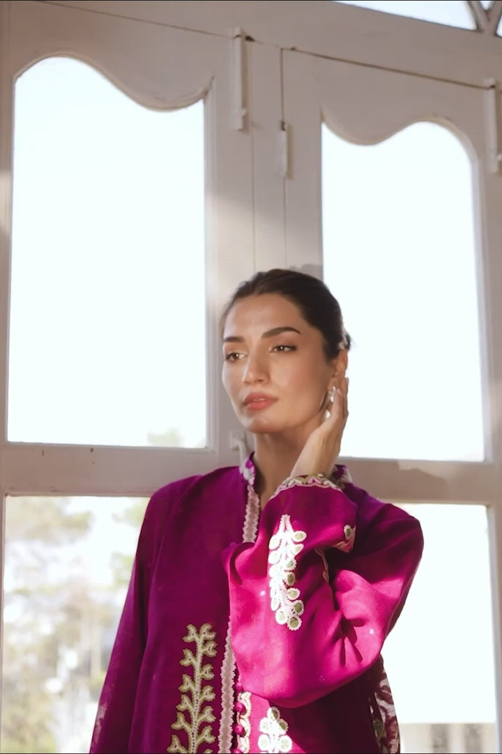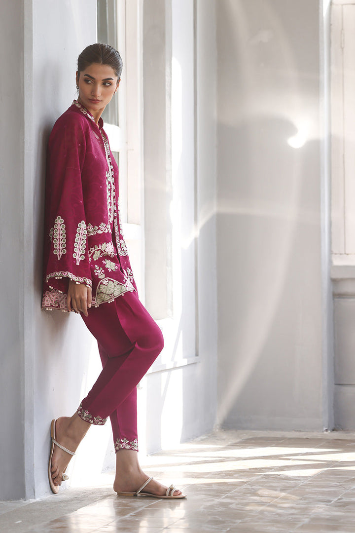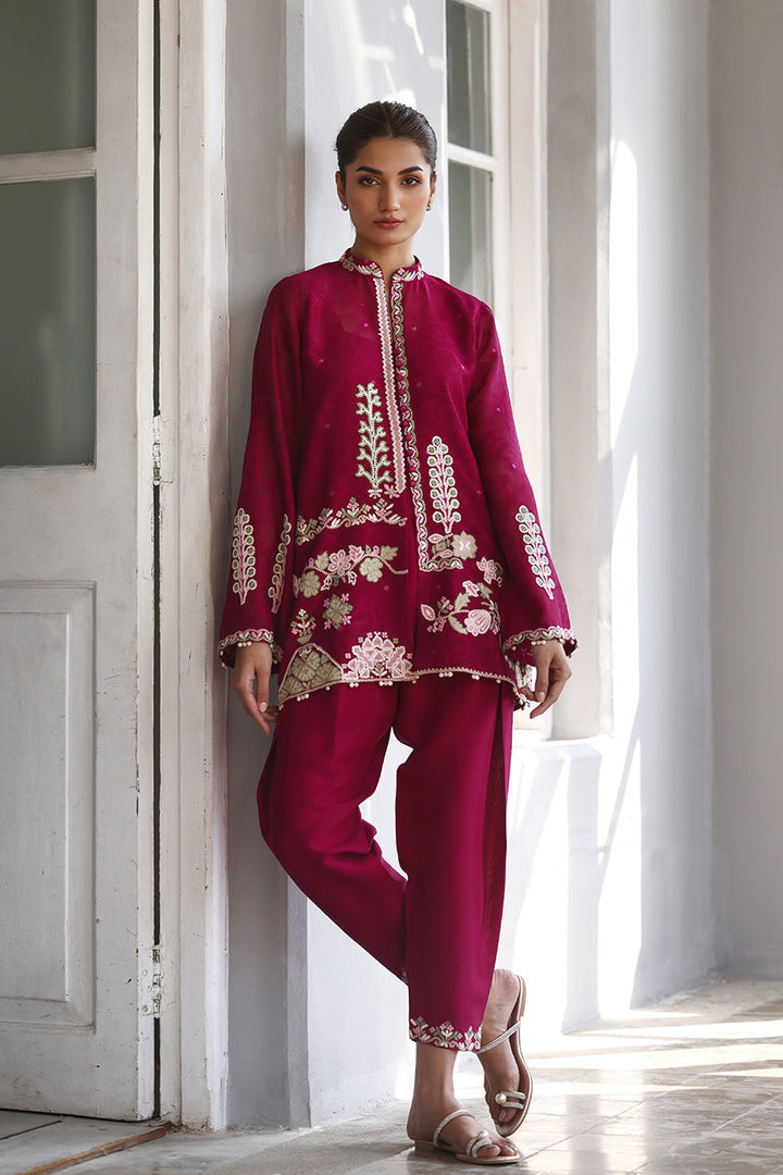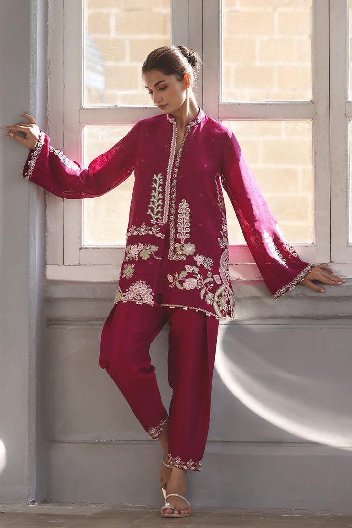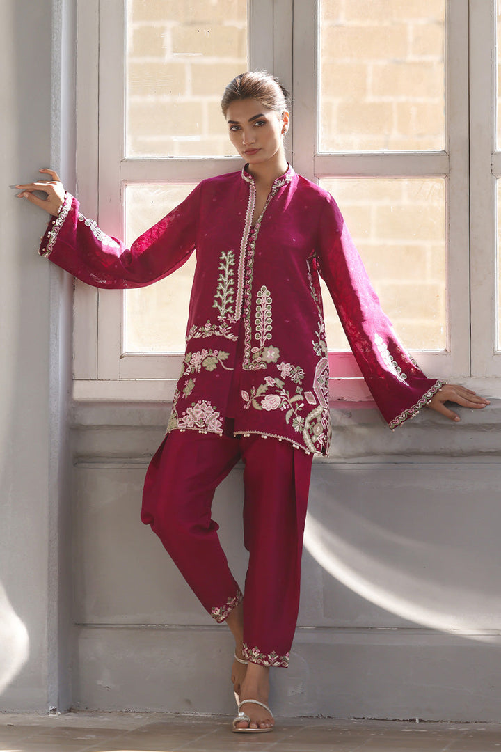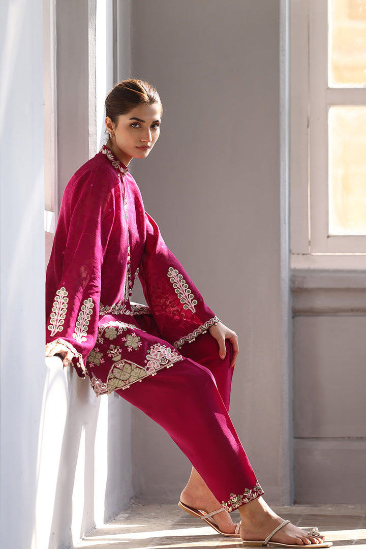 Perfect for formal evenings, a rich hibiscus hued ensemble effortlessly balances elegance and ease. A cotton net shirt features intricate applique detailing, enhanced by contrasting aari embroidery along its front open design. Paired with a matching pure rawsilk shalwar adding a polished touch.