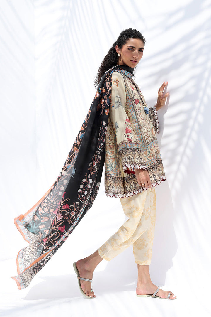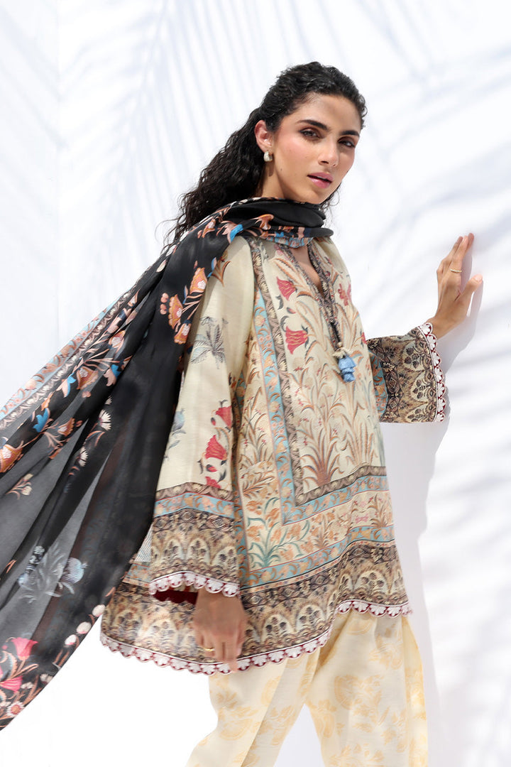 In a rich medley of earthy and ebony tones, the relaxed cotton net top is adorned with a dense, scenic botanical print reminiscent of ancient tapestries, rendered in muted shades of terracotta, green, and deep charcoal. It is paired with a pure Raw Silk draped shalwar in a softly patterned buttermilk hue, adding balance and fluidity. A contrasting medium silk dupatta in deep ebony, featuring bold florals framed by vibrant graphic borders, completes the look with a striking interplay of color and craft.