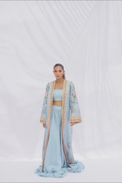 An ethereal pastel ice blue ensemble is adorned with delicate floral embroidery in soft peach and pale pink threads. The inner layer features a khaddi silk cropped bandeau top paired with a high-waisted skirt/lehenga, finished with a sweeping ruffled hemline. Draped over the set is a long, open jacket, framed by contrasting sand-toned borders embellished with floral vines. The result is a dramatically layered silhouette.
