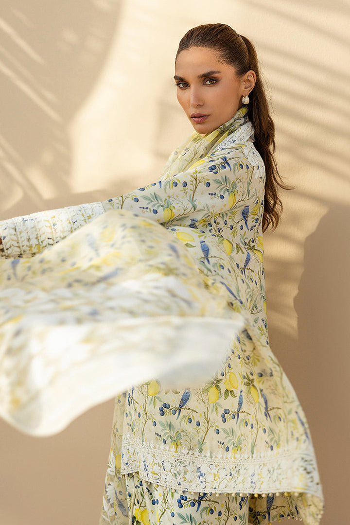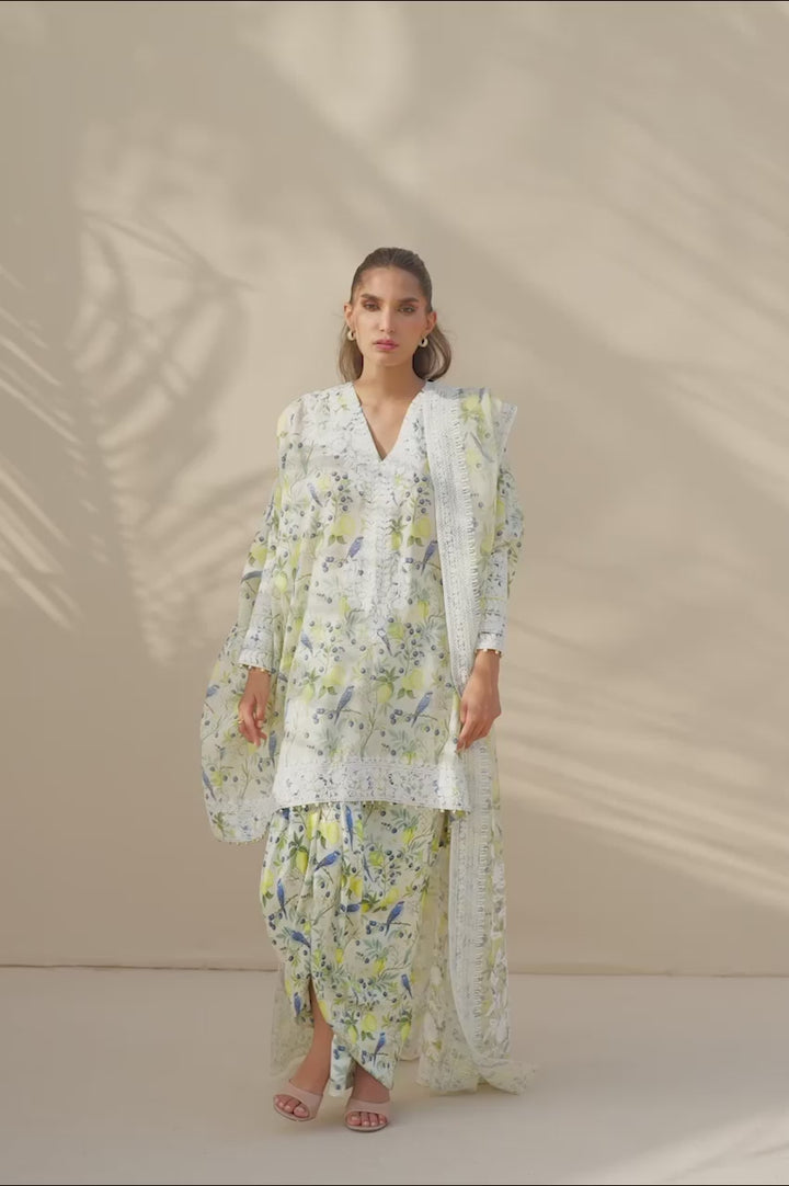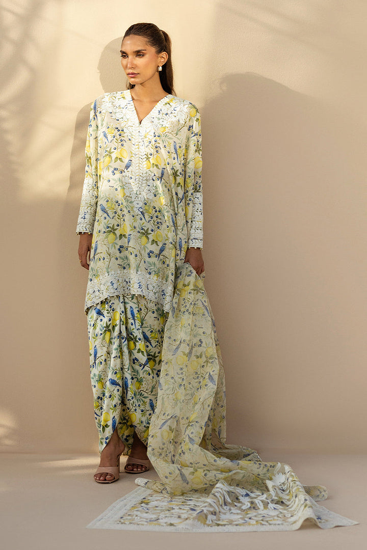 Bathed in a soft eggshell hue, this ensemble is patterned with azure and lemon yellow florals and avian motifs. The delicately printed shirt is elevated with aari embroidered vines framing the neckline, sleeves and hemline, infusing artisanal flair into its modern silhouette. It is paired with a matching printed draped skirt in charmeuse and a flowing organza dupatta with an aari embroidered pallu, lending the look a touch of regal grace.