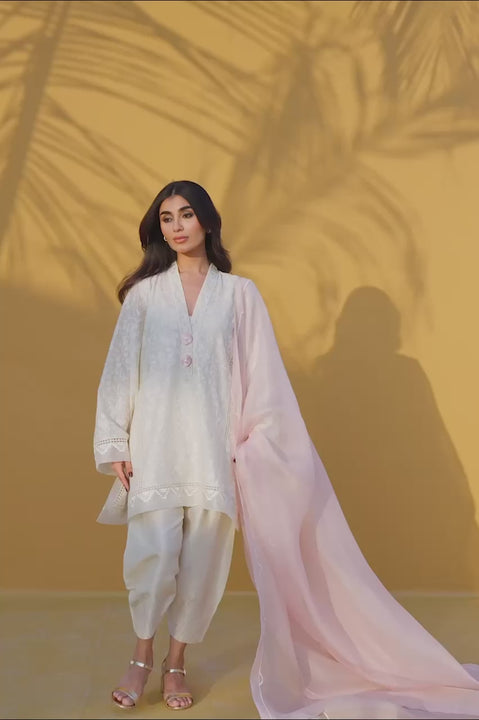 This ivory ensemble is defined by quiet elegance and refined detail. The cotton net shirt is delicately embellished with tonal embroidery, framed by a soft V neckline accented with button detailing, and finished with subtle embroidered accents along the hem and cuffs. Paired with a matching pure rawsilk shalwar, the look is layered with a sheer blush organza dupatta edged with minimal appliqué detailing, adding a gentle contrast.