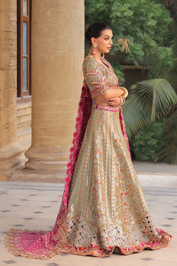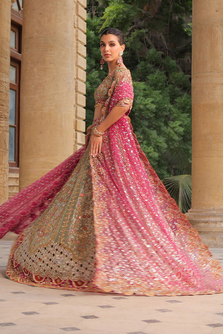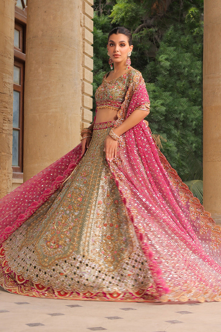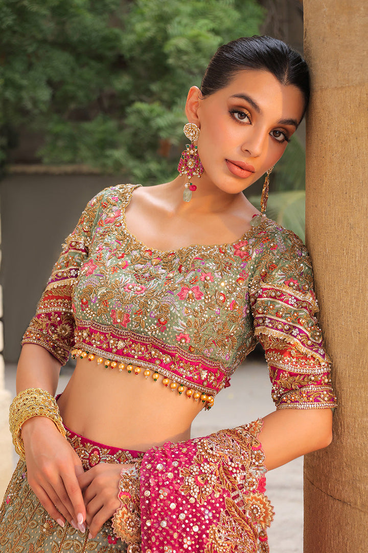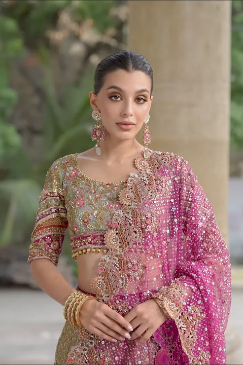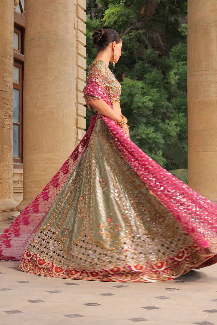 A majestic composition in celadon, rose gold, and mulberry, this bridal lehnga evokes timeless grandeur. Rendered in luminous tissue, the skirt blooms with resham, zardoze, sequins, and crystal work, unfolding into a chatapati hem finished with intricate cutwork. The cropped tissue choli echoes the lehnga’s ornate embroidery, its scalloped neckline and chatapati applique sleeves edged with delicate beaded tassels that sway with movement. A vivid mulberry tulle dupatta, sequined in fine detail, is embellished with scalloped borders, completing a poetic tribute to traditional artistry.