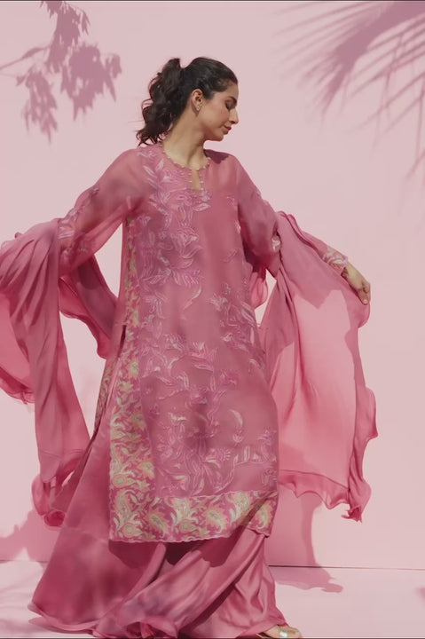 Capturing a sense of modern romance, a dusty rose ensemble unfolds in fluid layers, where a sheer organza shirt is adorned with floral embroidery that drifts across the surface in delicate, painterly trails. Ornamental kantha embroidered borders in warm peach and muted sage frame the hem and cuffs. A gently draped dhaka pajama/lehnga creates graceful movement, while a ruffled georgette dupatta pools effortlessly to complete the look with poetic ease.