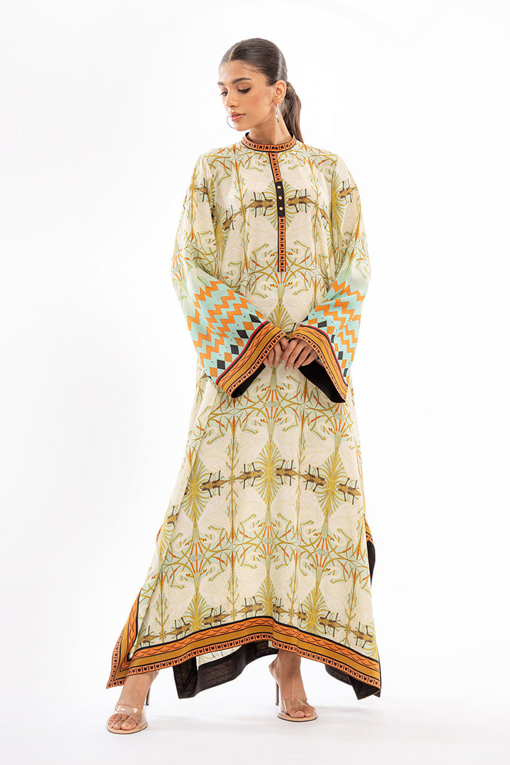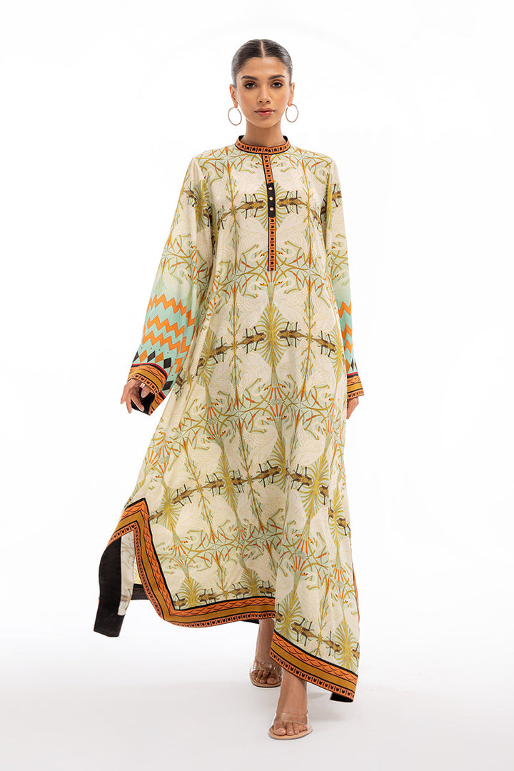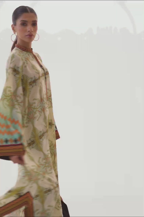 A digitally printed box cut kurta is cut from pure crepe and features swan imagery. Accented with worked buttons on the neckline, the kurta is paired with matching crepe culottes.