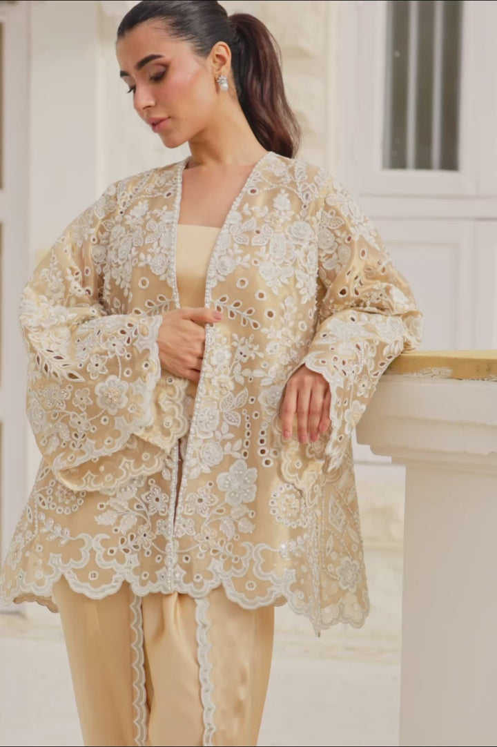 A whisper of gold, this ensemble pairs an opulent tissue jacket with charmeuse silk separates. The jacket blooms with intricate ivory threadwork, appliqué details, and cutwork florals, scalloped along the hem and flared sleeves for dramatic grace. A sleek charmeuse tube top anchors the look, while a tapered tulip shalwar in charmeuse is adorned with floral embellishment, scalloped edges, and tonal appliqué embroidery trailing the seams for a soft, elegant finish.