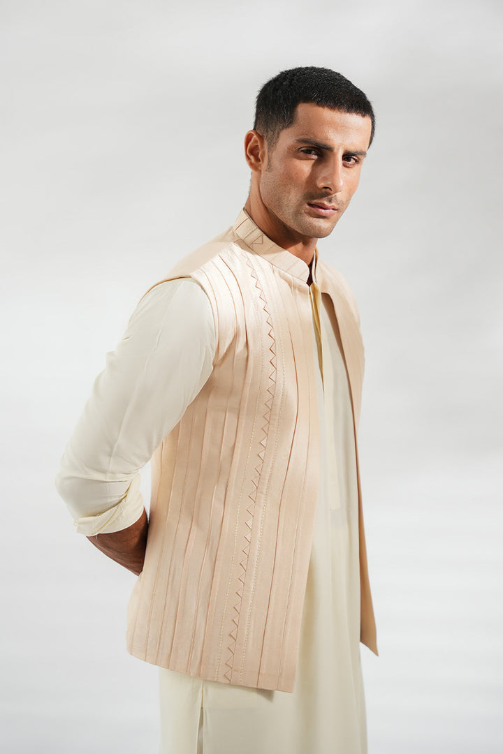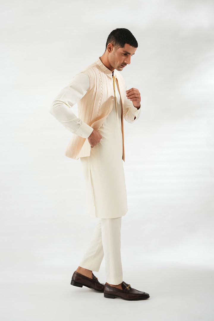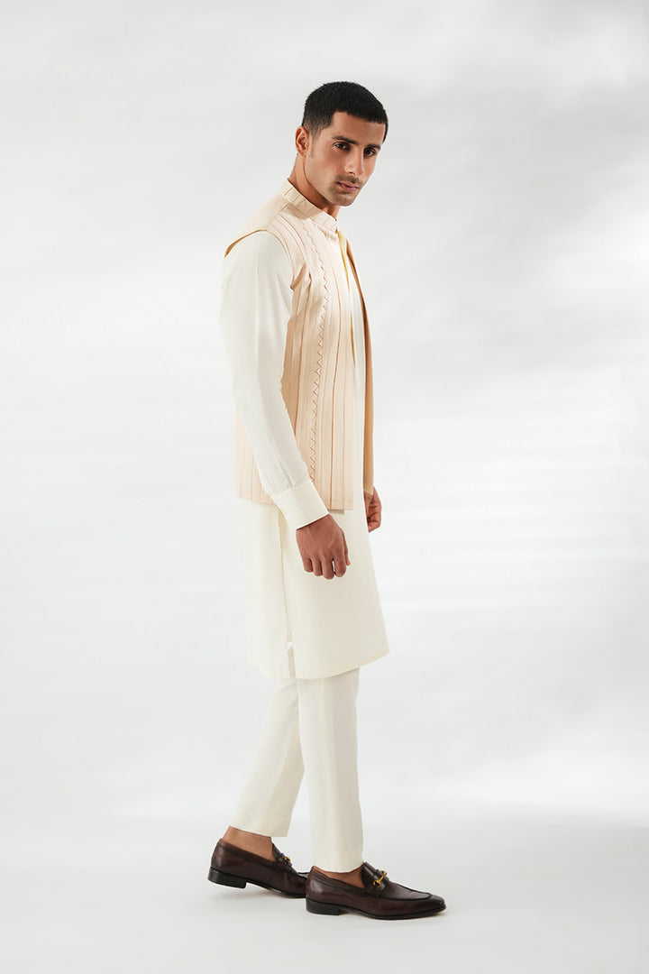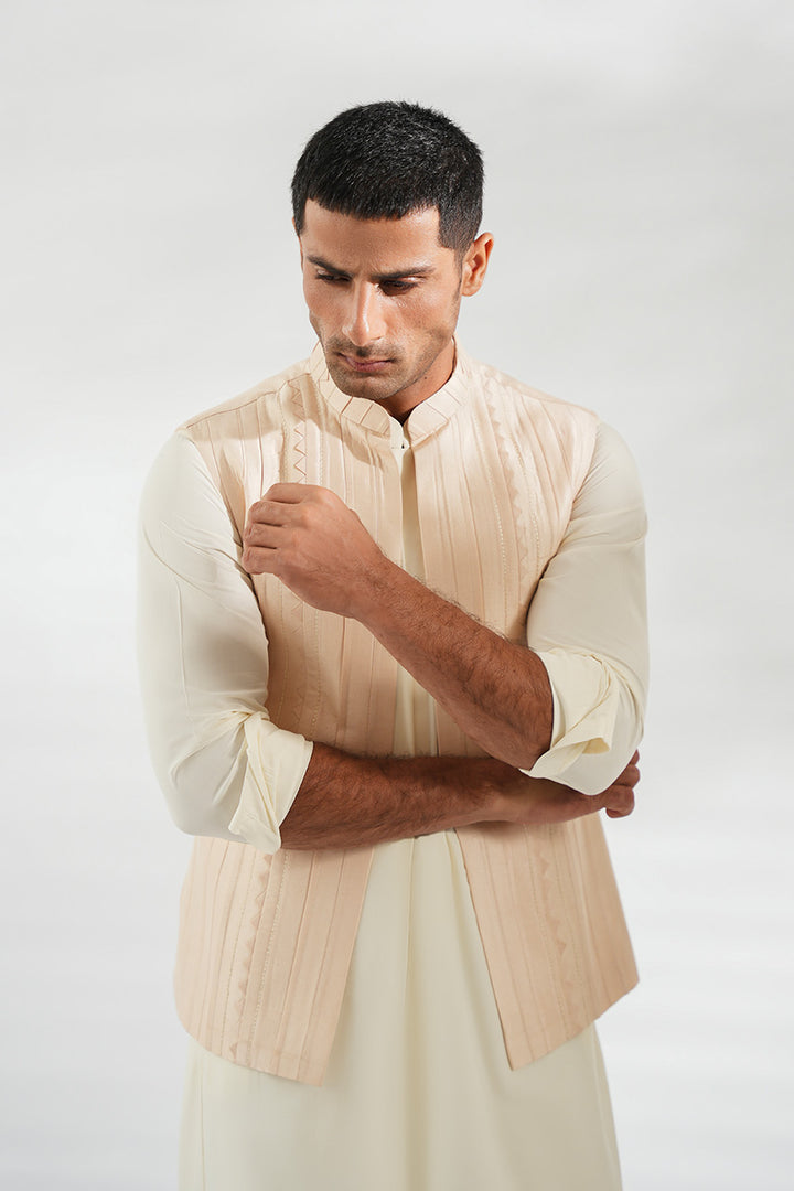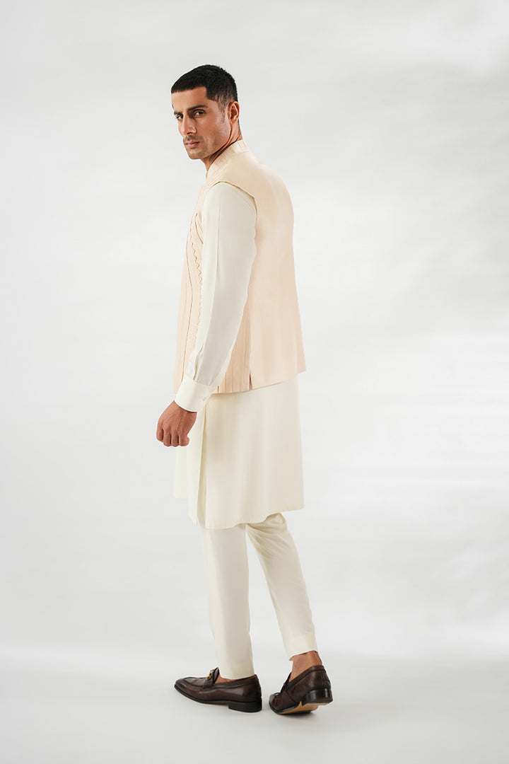 An ivory kurta set is paired with a front-open waistcoat in a soft blush tone, elevated with refined pintuck detailing. The structured tailoring of the pure raw silk ensemble and mandarin collar lends a modern edge to tradition, creating a look that balances understated charm with festive refinement.