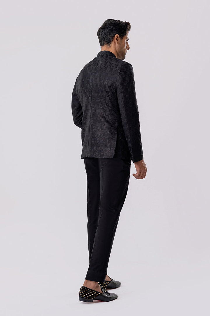 A charcoal prince coat in a textured silk thread embroidered pattern is lined with a signature SM print. The matching printed pocket square enhances the look. Pair this coat with our tailored woven straight-cut pants.