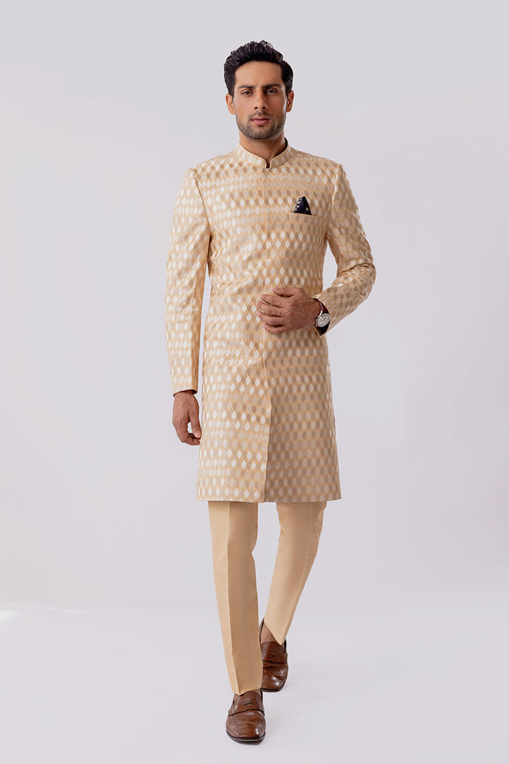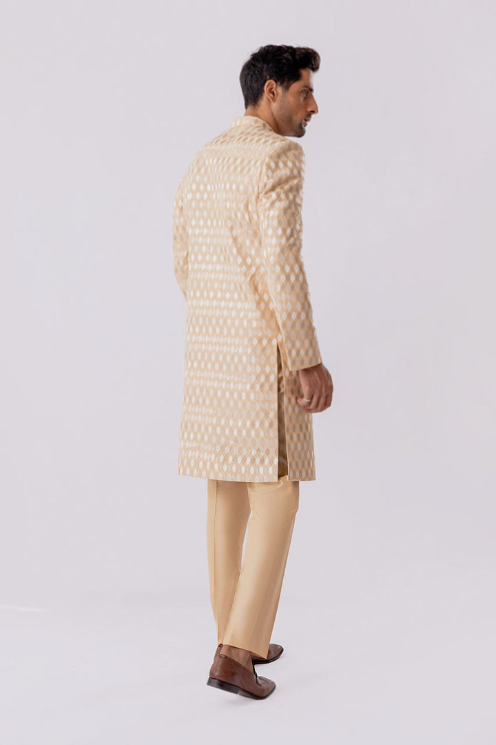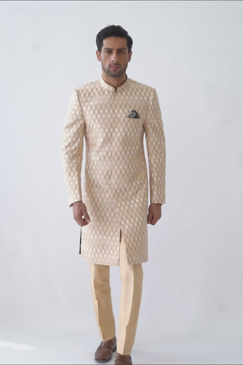 A beige raw silk self embroidered sherwani with matching raw silk trousers. Lined with a quintessential SM print in medium silk with a matching printed pocket square.