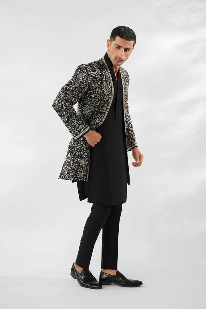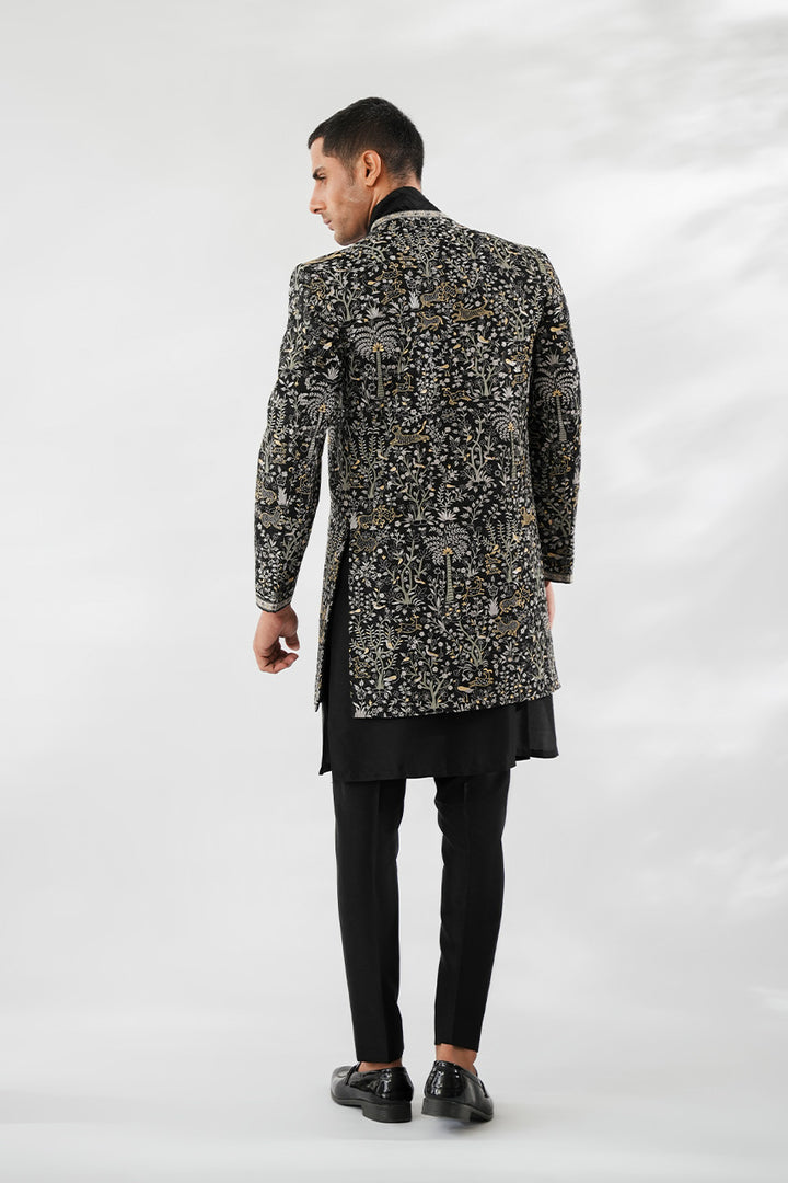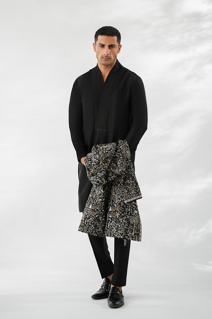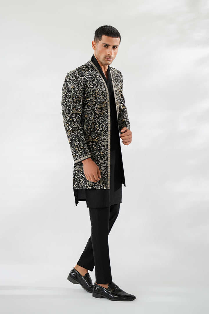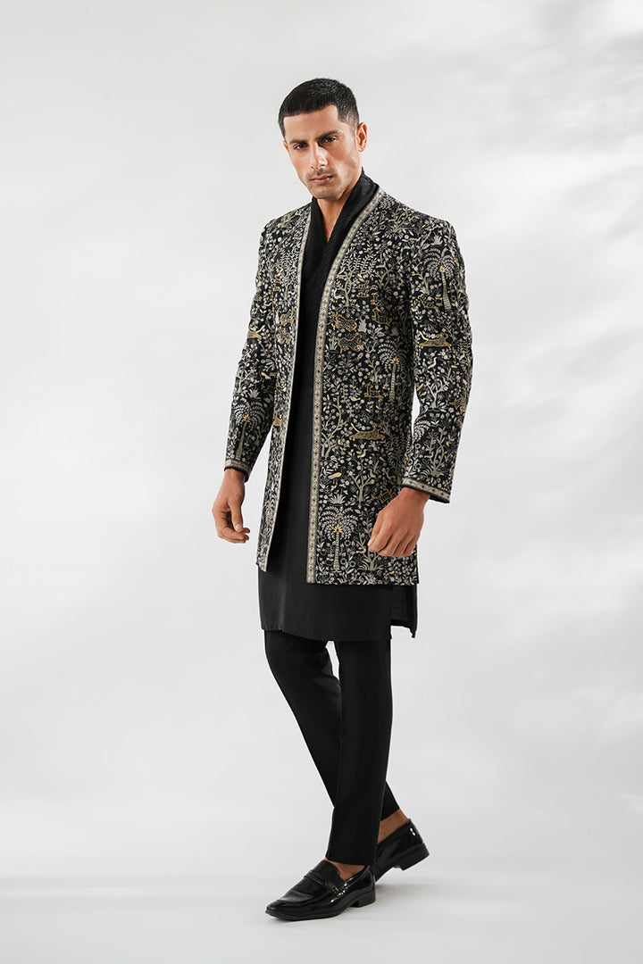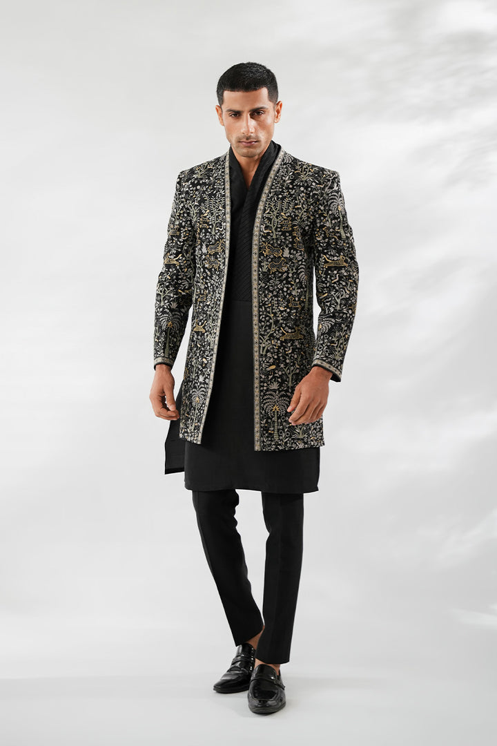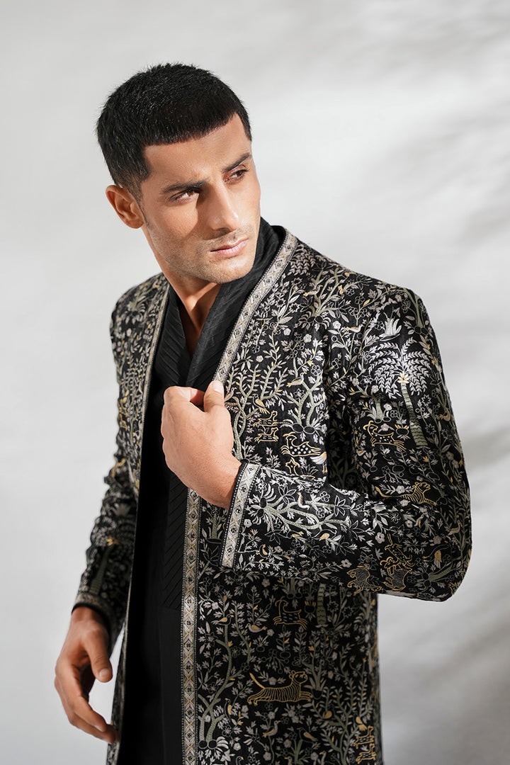 An elevated take on the classic, this ebony front open sherwani in self jamawar is adorned with intricate aari embroidery depicting wildlife motifs across the front. Layered over a coordinating raw silk shirt with a statement pleated neckline, the ensemble is grounded with tapered rawsilk pants for sharp sophistication.