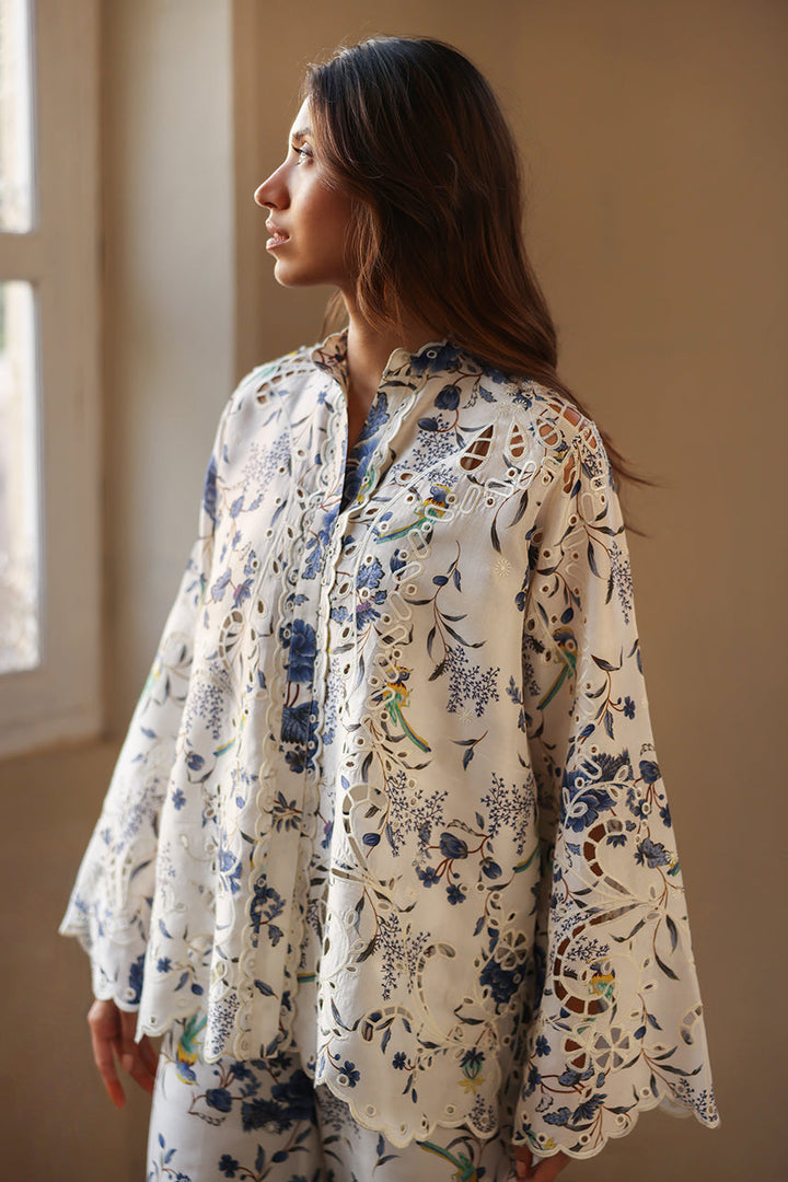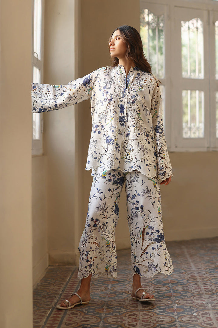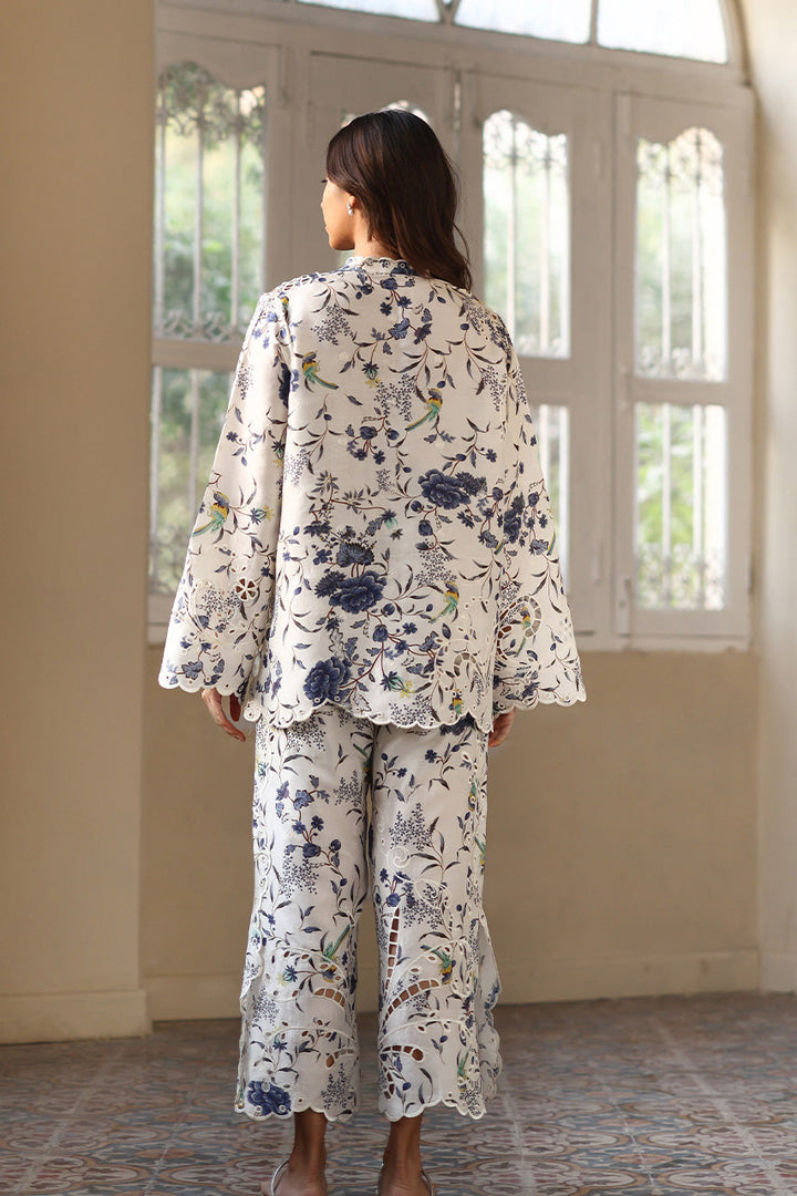 Effortlessly refined, a pearl hued printed co-ord set is intricately embroidered with scalloped edges and eyelet embroidery. Adorned with delicate indigo florals and multi-hued bird accents, the ensemble is crafted from pure rawsilk. Matching culottes feature a scalloped hem and eyelet accents.
