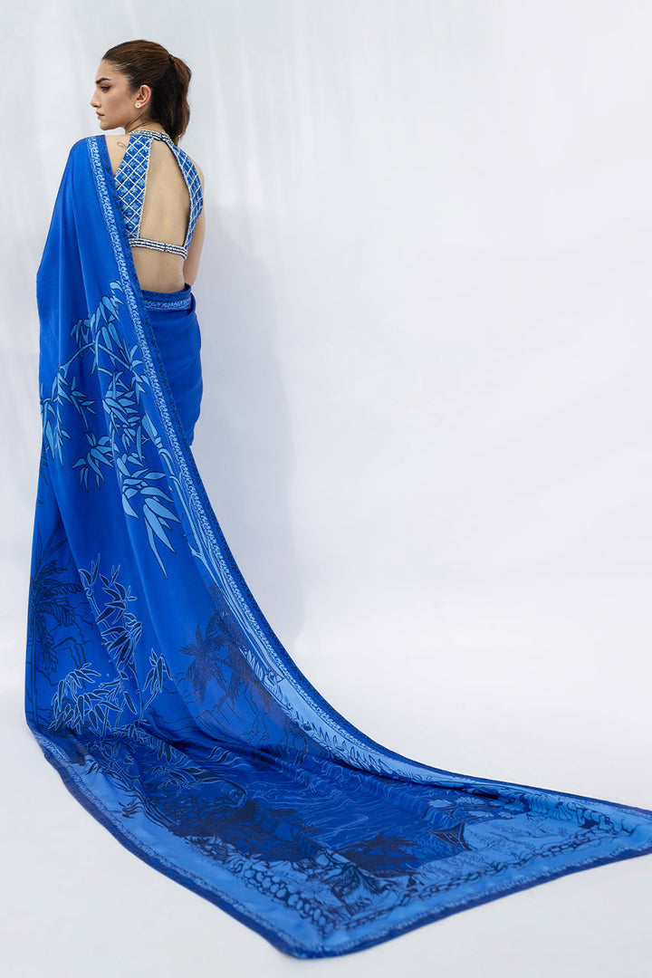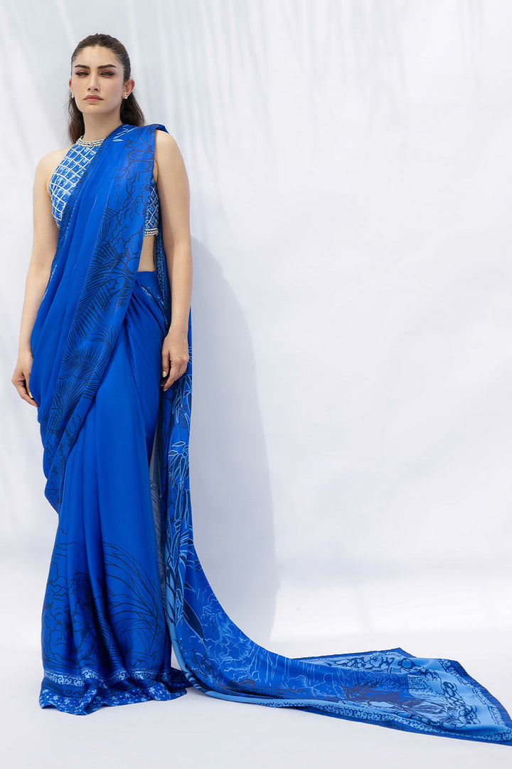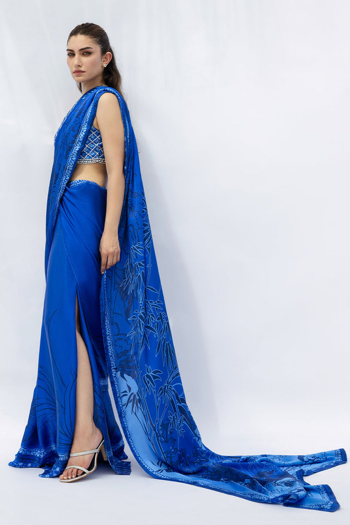 In a striking shade of cobalt, this charmeuse sari evokes a sense of modern regality. The fluid drape falls effortlessly, its cascading pallu adorned with tonal botanical patterns that recall hand painted artistry. Paired with a halterneck printed blouse in pure rawsilk, detailed with geometric embroidery, the look carries the quiet drama of timeless craftsmanship.