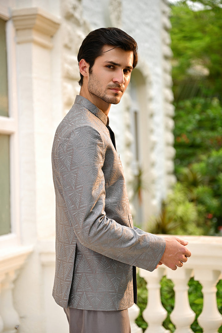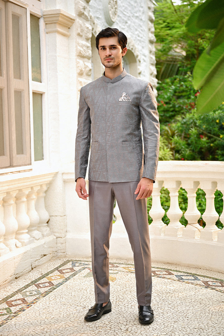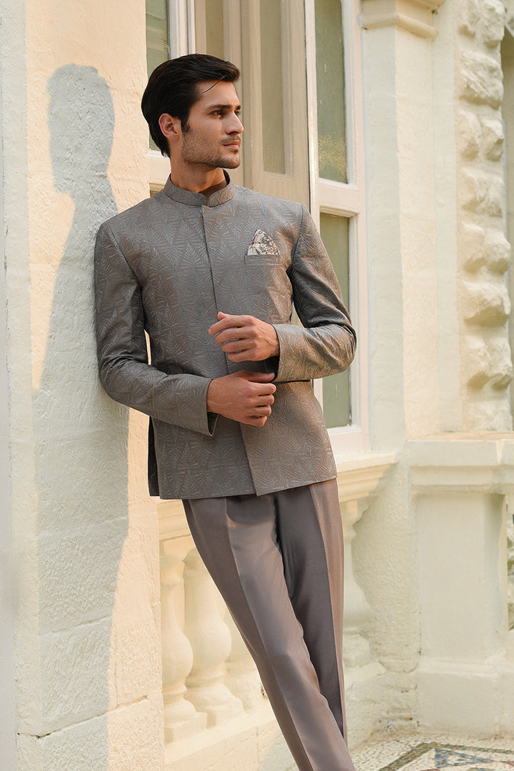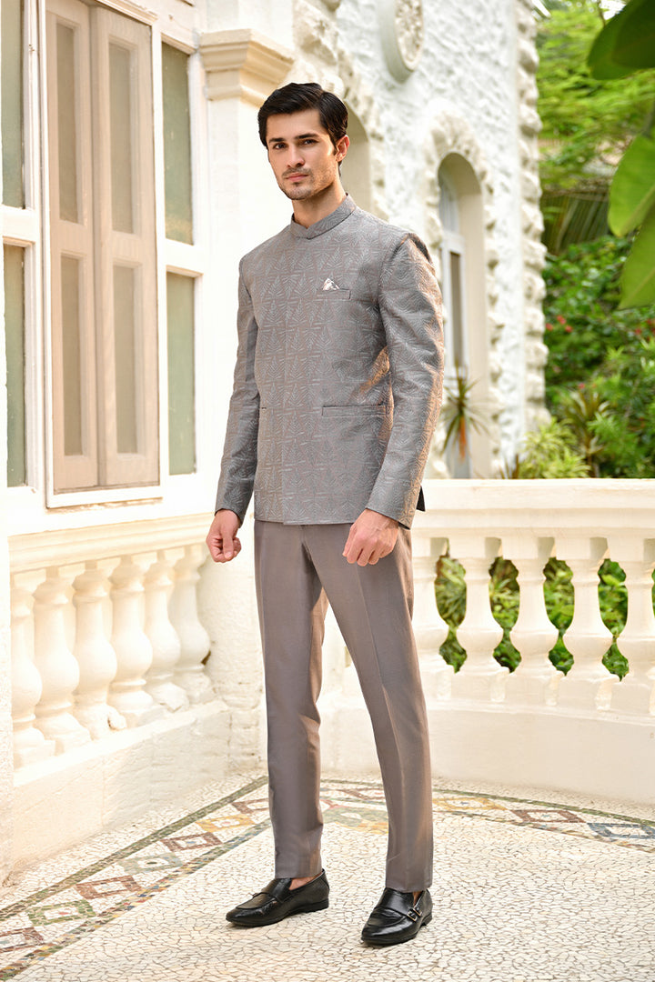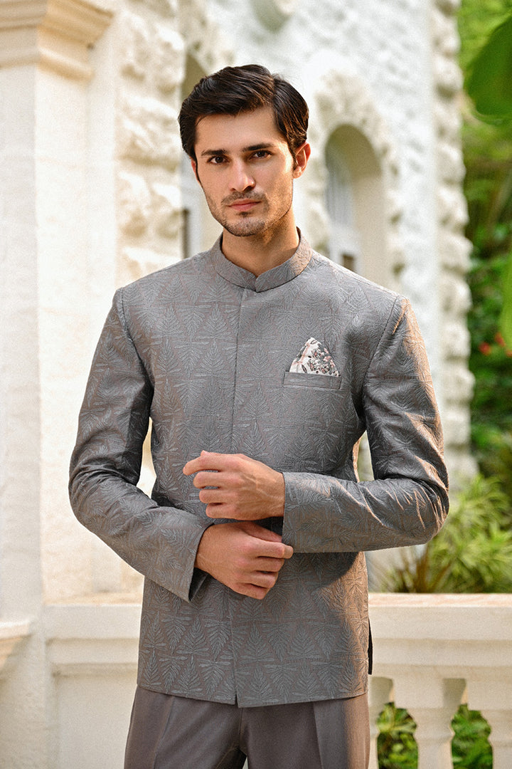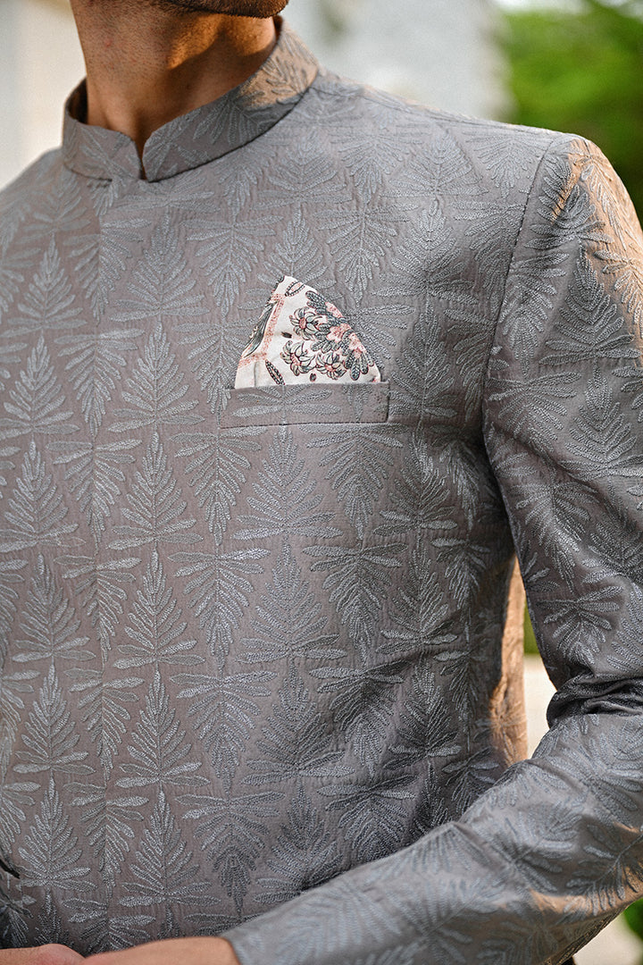 A contemporary prince coat in slate grey pure rawsilk, enriched with tonal embroidery of botanical motifs arranged in a precise geometric rhythm that creates depth and subtle texture. An ivory pocket square patterned with soft grey florals offers a graceful accent, while pure raw silk pants echo the coat’s refined tone.