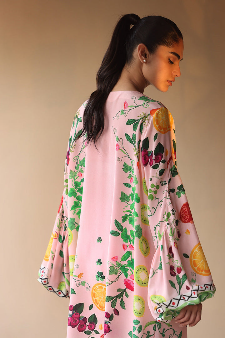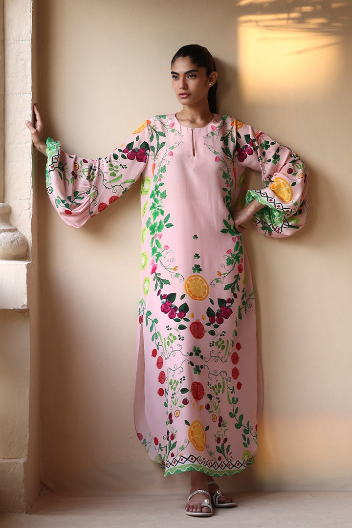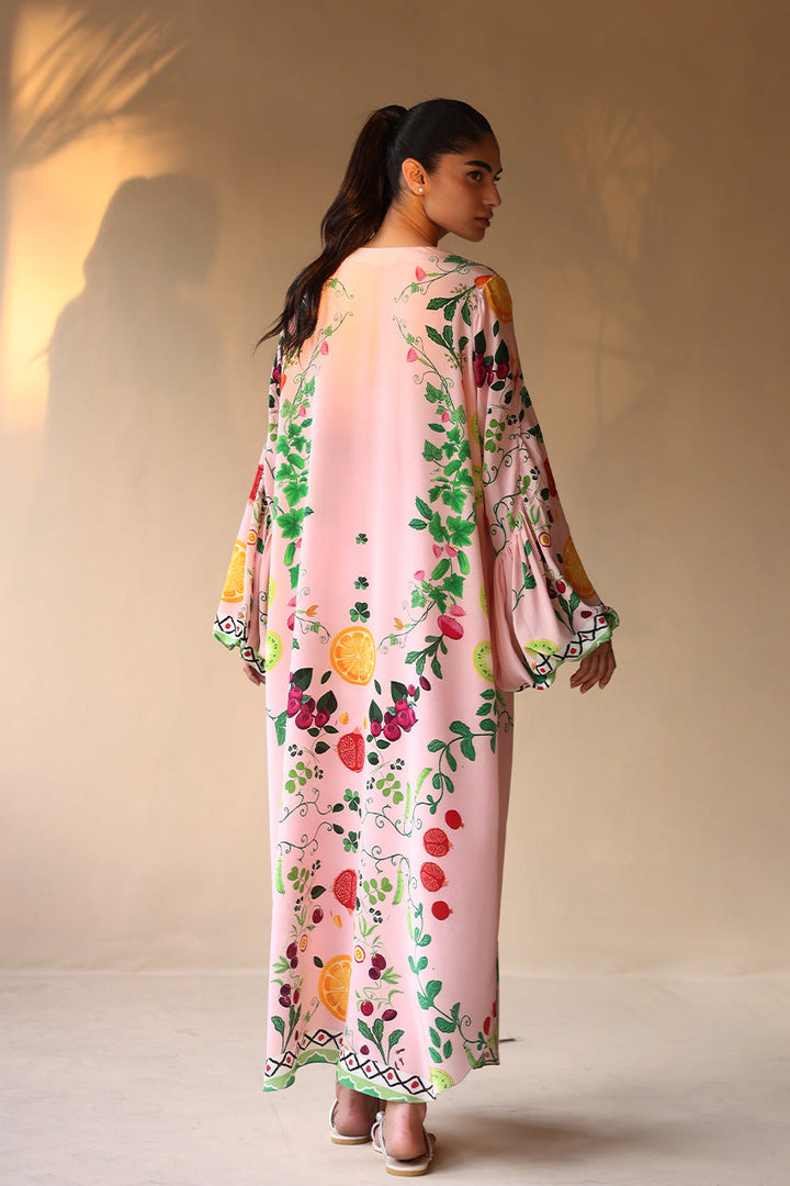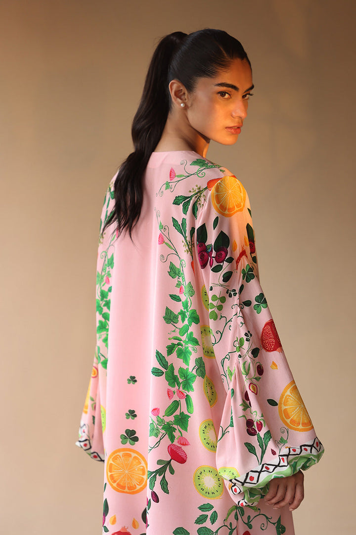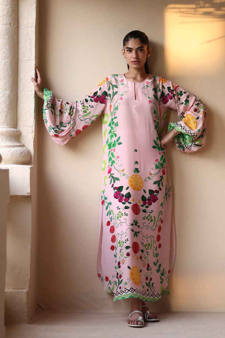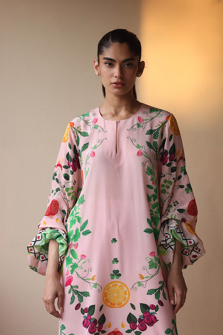 A poetic ode to nature's candy, a playful crepe kaftan is rendered in a delicate blush hue, adorned with intricate vine and citrus motifs in verdant and ember tones. Voluminous balloon sleeves add a fanciful touch. Paired with matching pure rawsilk trousers.