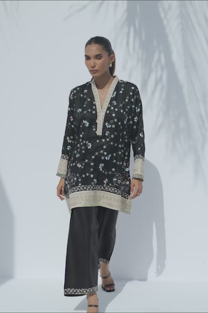 Cut from lustrous ebony hued self jamawar, this ensemble exudes quiet luxury through its intricate floral embroidery. The relaxed top is adorned with resham work in soft, multi-hued florals, framed by appliqué borders in cream and blush along the V-neckline, cuffs, sides, and hem. Paired with matching pure Raw Silk straight trousers featuring delicately embroidered hems, the look reimagines timeless craftsmanship with a modern sensibility.
