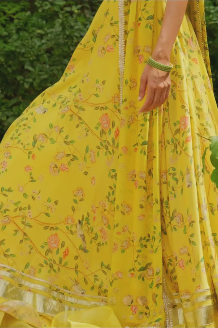 In luminous daffodil yellow, this lehenga set captures the lightness of summer with refined craft. The sleeveless khaddi silk blouse is delicately embroidered with gota, catching the sun with every movement. The flowing khaddi silk lehenga blooms with florals in soft rose and sage, its hem bordered with glistening gota and layered in cascading ruffles that ripple with ease. A matching georgette dupatta, edged in gota and finished with playful tassels, completes the ensemble in a spirit of effortless festivity.