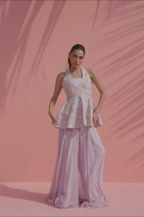Balancing lightness and structure, this lilac hued cotton net sleeveless top is delicately embroidered with ivory floral motifs and shaped into a gentle peplum silhouette that defines the waist. Paired with a matching pure crepe tube top and a flowing sheer georgette dhaka pajama that falls effortlessly to the floor, the look feels airy, refined, and quietly romantic.