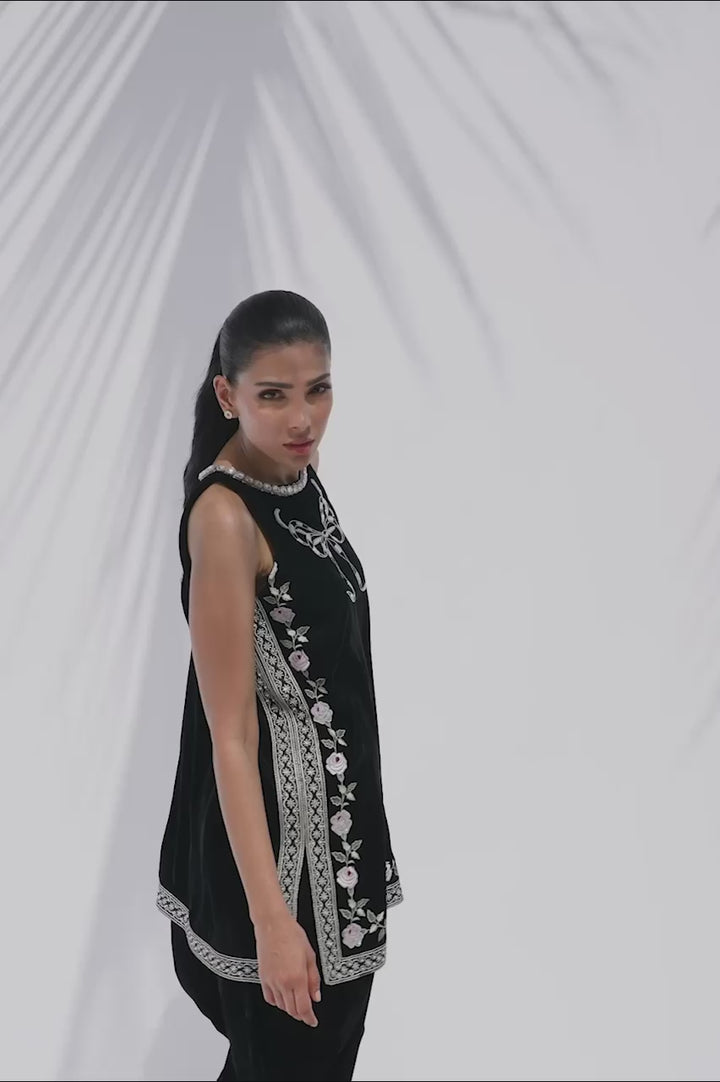 A vision of contemporary elegance, this ebony velvet shirt is tailored in a sleeveless A-line silhouette. Delicate embroidery adorns the neckline with a bow motif and traces the borders in soft floral vines. Paired with a velvet balloon shalwar that balances fluidity and structure, the look is finished with a pearl and diamante edged neckline, embodying modern glamour.