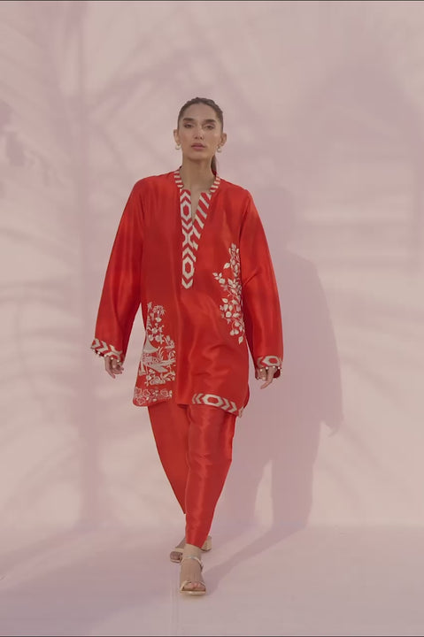 A tangerine composition defined by striking contrast and refined surface detail. The pure rawsilk kurta is accented with bold geometric details along the neckline, cuffs, and hem, while scenic ivory embroidery are artistically arranged across the front. Clean lines and a softly rounded hem lends effortless structure. Paired with a matching pure rawsilk shalwar, the look is poised. and modern.