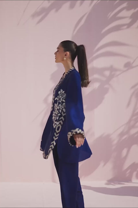 A deep sapphire composition defined by striking contrast and refined surface detail. The pure rawsilk kurta is accented with bold geometric details along the neckline, cuffs, and hem, while scenic ivory embroidery are artistically arranged across the front. Clean lines and a softly rounded hem lends effortless structure. Paired with a matching pure rawsilk shalwar, the look is poised. and modern.