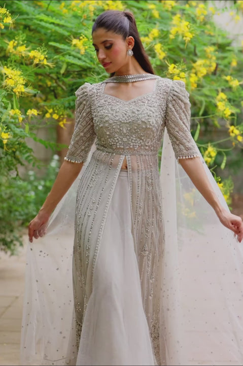 Moonlit platinum tulle layered over a brocade tube top, this front open peshwas shimmers with tonal sequins, pearls, and zardoze embroidery. The bodice is framed with a sweetheart neckline and puffed shoulders, recalling the romance of old world couture, while fitted sleeves glisten with uniform embellishment for a balanced finish. A diaphanous tulle choker dupatta, strewn with sequins, veils the look in celestial light. Beneath, billowing layers of tulle form a voluminous lehnga, moving with regal fluidity. Sculpted in light and shadow, the ensemble captures a timeless grandeur.