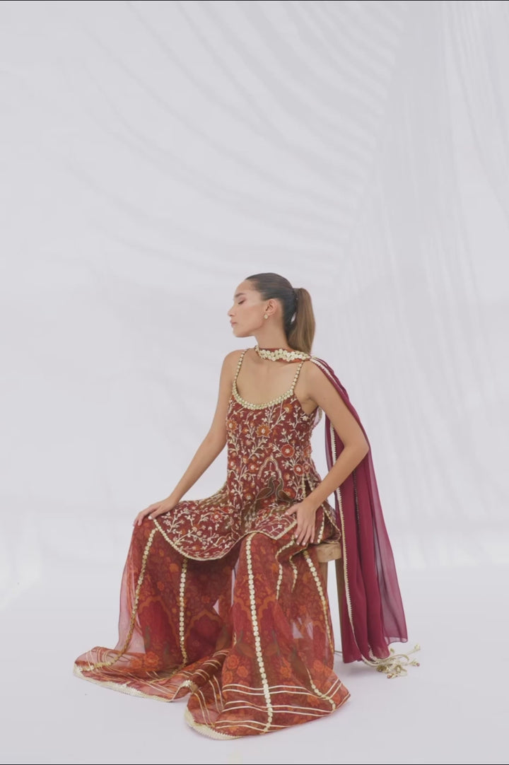 Burnished burgundy sets the tone for this ensemble, radiating regal ease. The organza shirt is richly embroidered with gold threadwork, its surface alive with winding vines and florals highlighted with accents of gota. Paired with an organza dhaka pajama, the silhouette is framed with metallic gold gota vines that shimmer in the light. A matching georgette choker dupatta, adorned with gota embellishment, completes the look with timeless elegance.