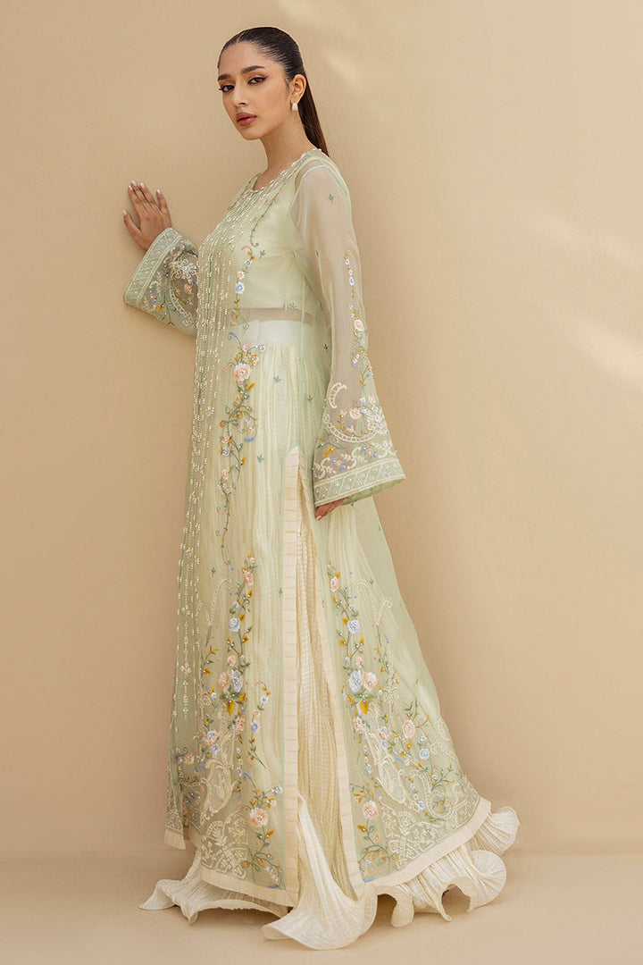 Awash in muted mint tones, a sheer front open shirt is detailed with floral threadwork, sequin accents, and handcrafted tassels that cascade down the front. Paired with a pleated crushed skirt that falls in graceful swirls, it becomes an ethereal statement.