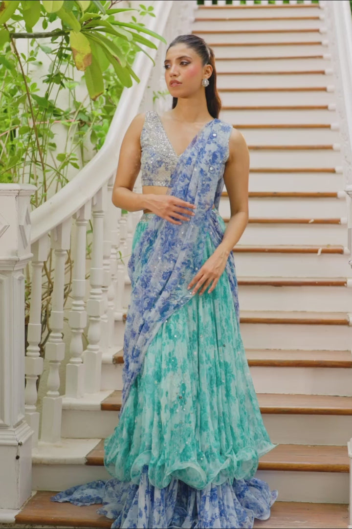 Awash in tones of azure, this ensemble evokes the freshness of summer skies and sea. The khaddi silk blouse, cut with a sharp V neckline, shimmers with silver gota and bead embroidery, adding a touch of brilliance. A layered chiffon lehenga blooms with teal and azure florals, lightly dusted with sequins for a glimmering effect. A diaphanous chiffon dupatta in matching tones, printed with delicate florals, drapes effortlessly to complete the look.